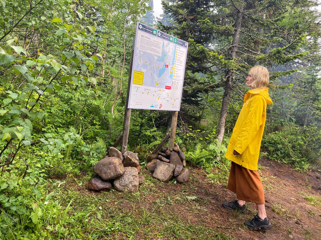 Этим летом мы обновили карту на старте эко-тропы и добавили от себя ещё такие же карты на тропе в узловых перекрёстках. Указали здесь режим работы подъёмников, чтобы туристы смогли рассчитывать силы по дистанции.