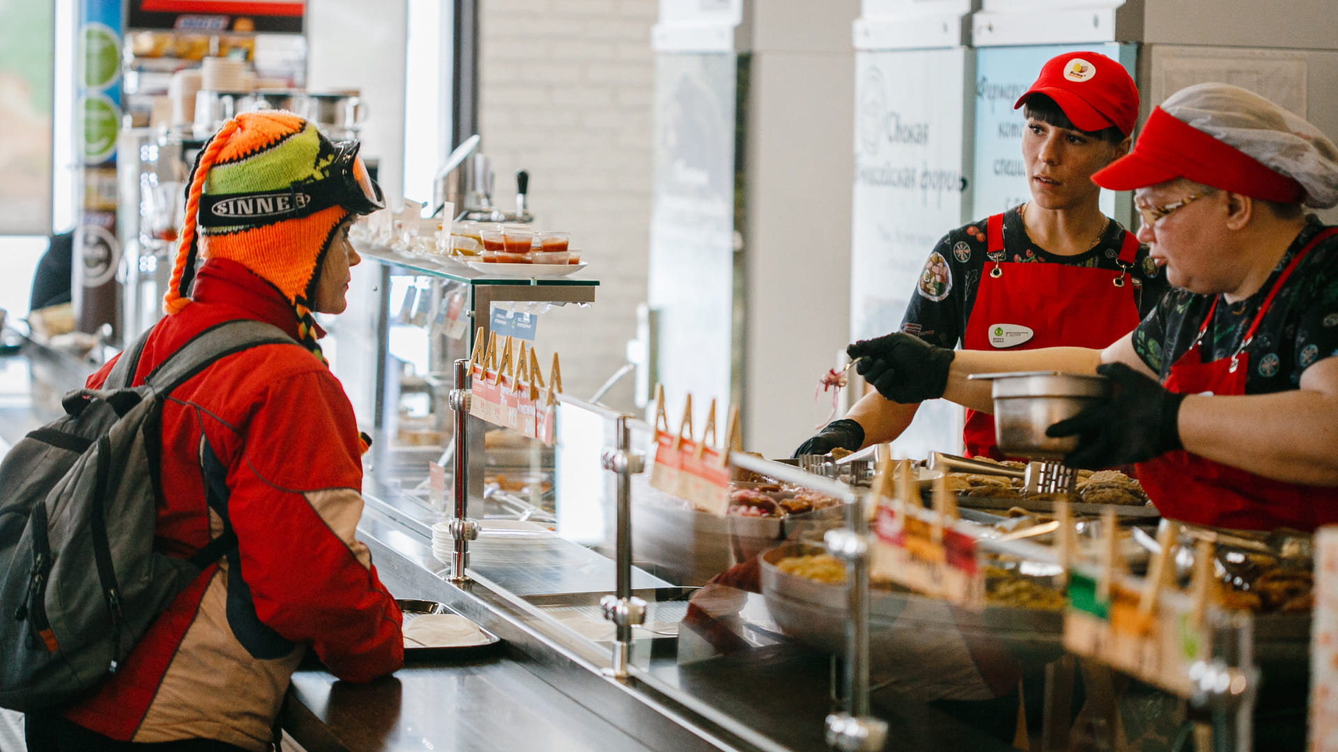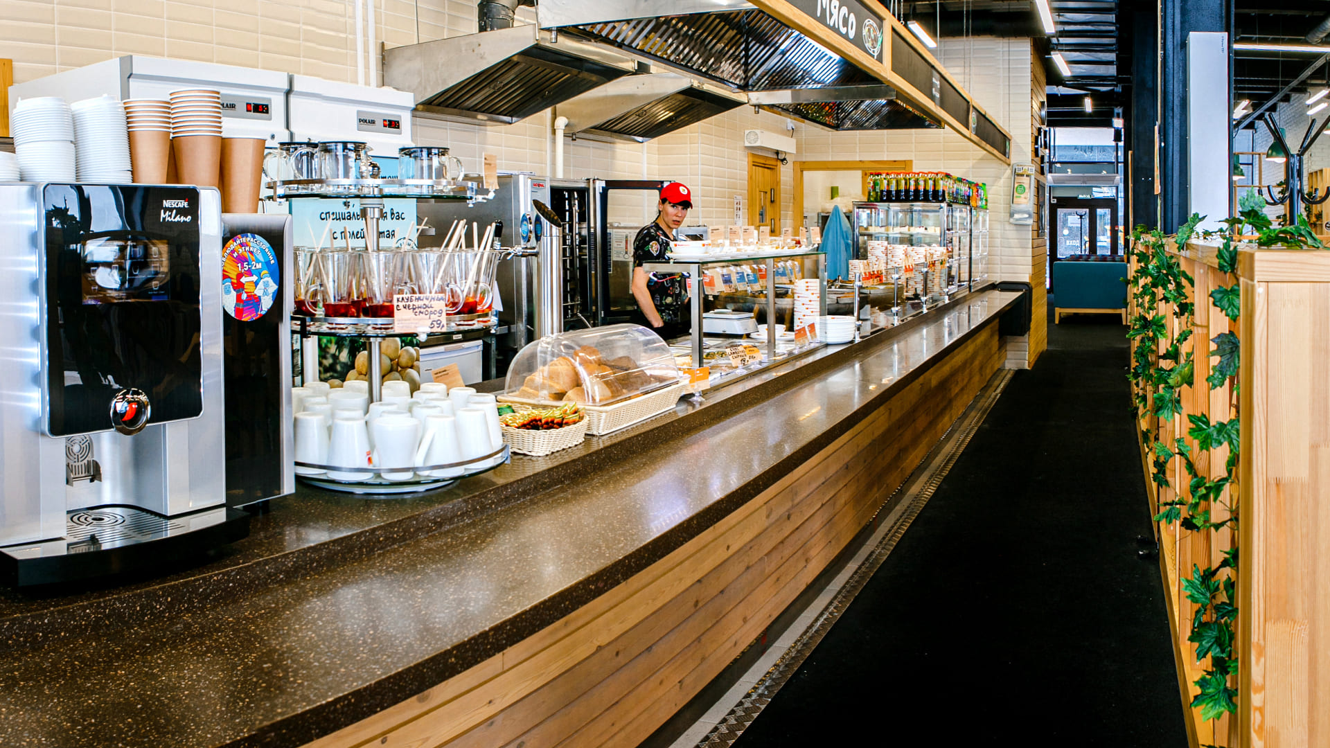 Знакомый всем ресторан быстрого обслуживания с линией раздачи блюд по низким ценам.