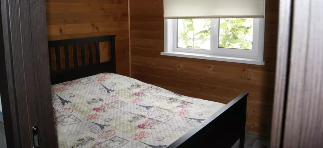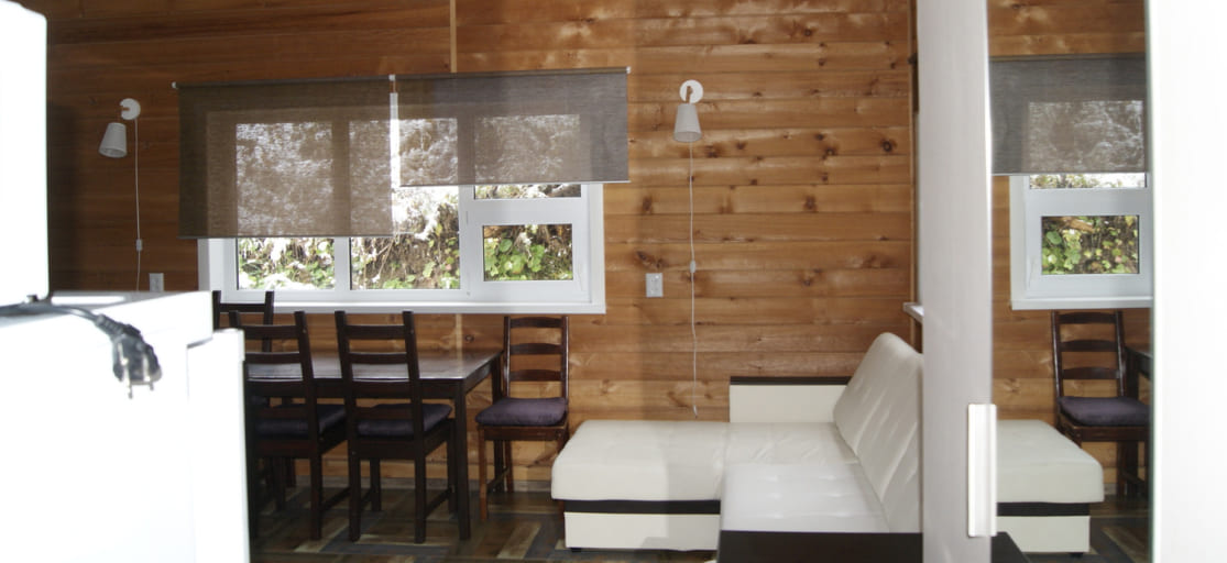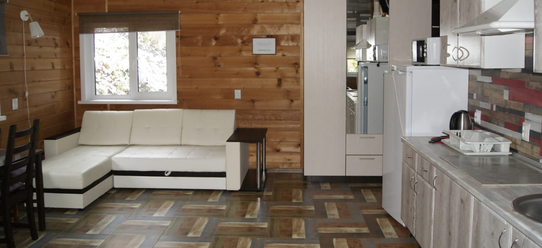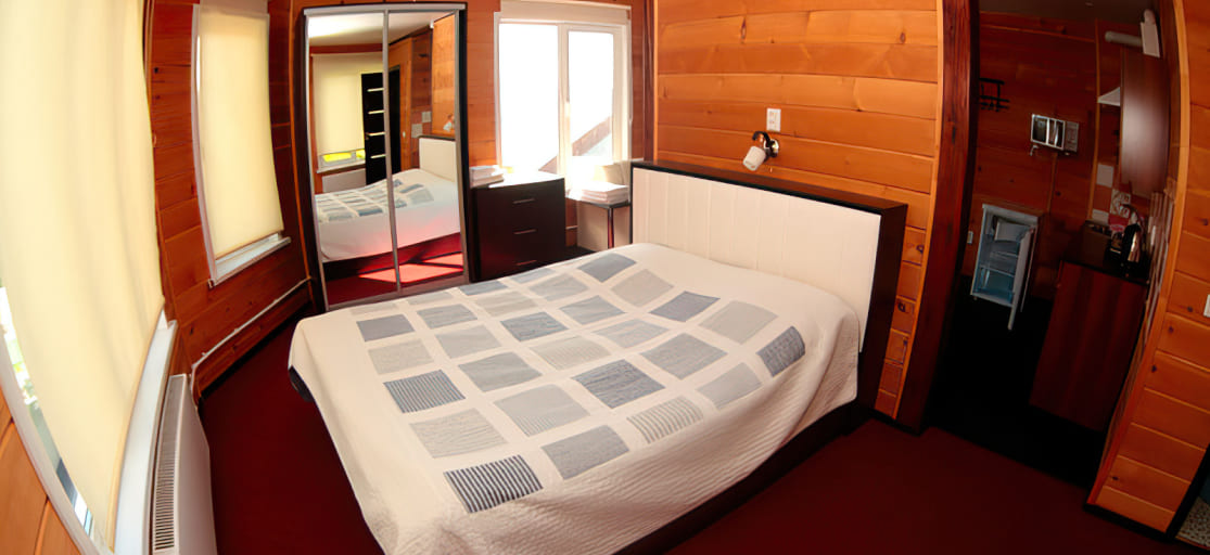 Просторный однокомнатный номер, разделенный на две зоны: спальню и кухню. Спальная зона: двуспальная кровать, раскладной двуспальный диван, шкаф для одежды, журнальный столик, мини-комод. Кухонная зона: стол, стулья, холодильник, плита на две конфорки, микроволновая печь, чайник, посуда, раковина, ТВ, санузел. Санузел: душевая кабина, раковина, зеркало, унитаз.
