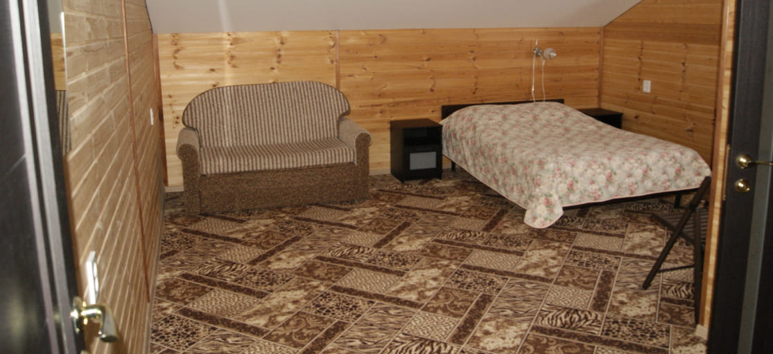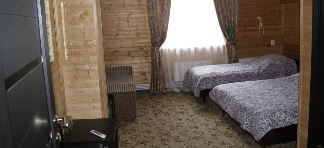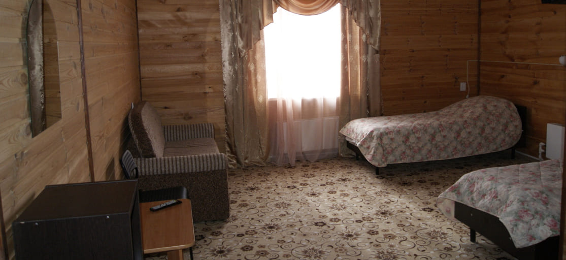 Однокомнатный номер. В номере: две односпальные кровати (можно сдвинуть в двуспальную), диван, ТВ, столик, стулья. Санузел: душ, раковина, зеркало, унитаз.