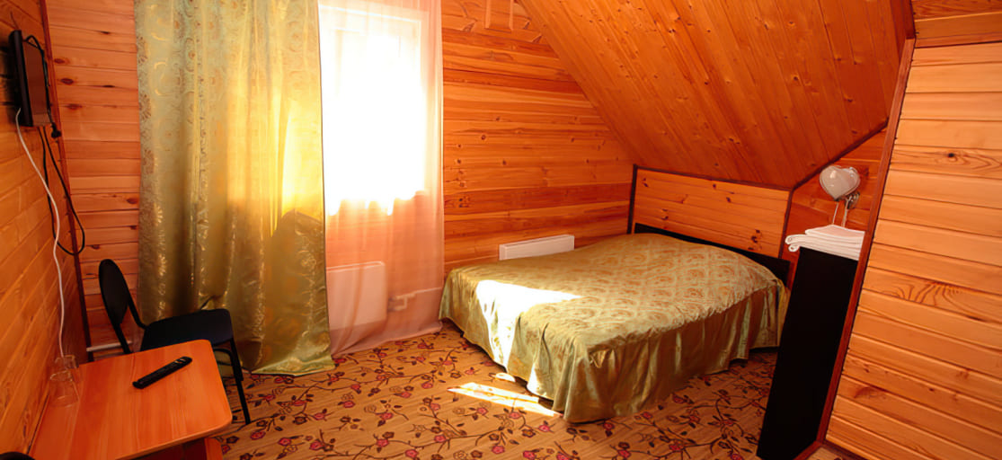 Однокомнатный номер. В номере: двуспальная кровать, ТВ. Санузел на два номера. Санузел: душ, раковина, зеркало, унитаз.