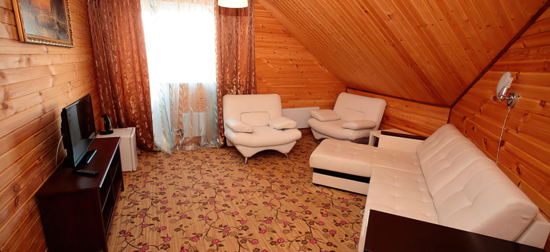 Большой двухкомнатный номер. Спальня: двуспальная кровать, тумба, ТВ, 2 стула. Гостиная: мягкая мебель (раскладной двуспальный диван + 2 кресла), ТВ, столик, мини-холодильник, чайник. Санузел: душ, раковина, зеркало, унитаз.