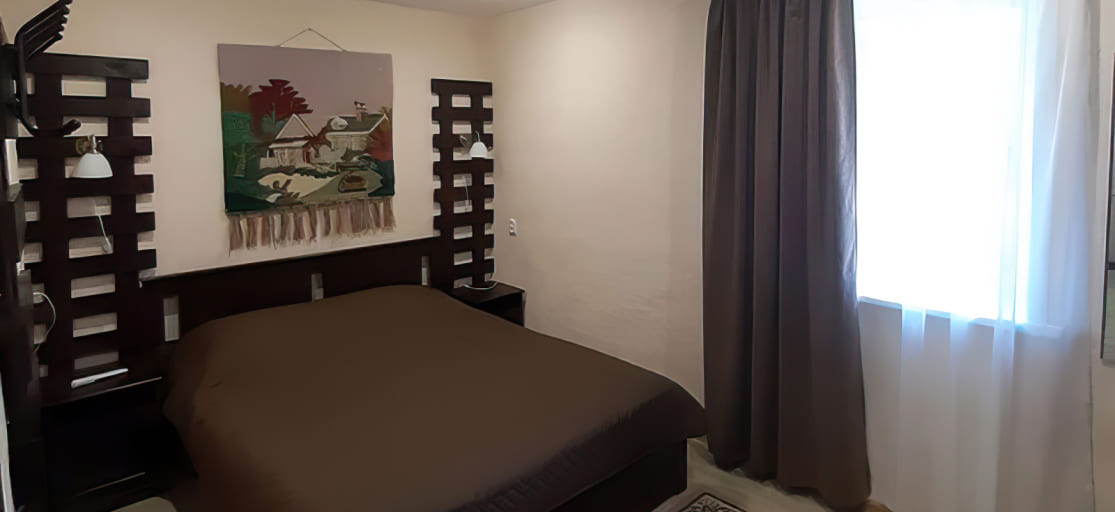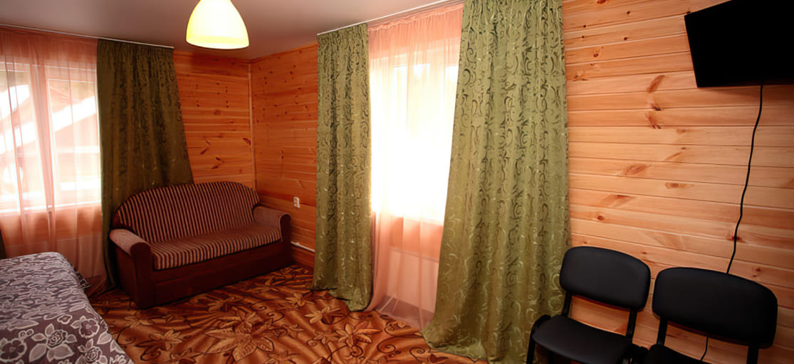 Двухкомнатный номер (на втором или третьем этаже отдельностоящего здания). Гостиная, совмещенная с кухонной зоной (электрическая печь, холодильник, СВЧ-печь, чайник, набор посуды): угловой диван, шкаф, стол, стулья, зеркало, телевизор. Спальня: двуспальная кровать, прикроватные тумбы, вешалка, стол, стулья, телевизор.