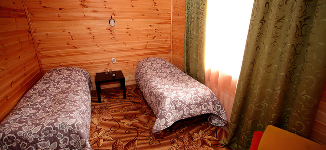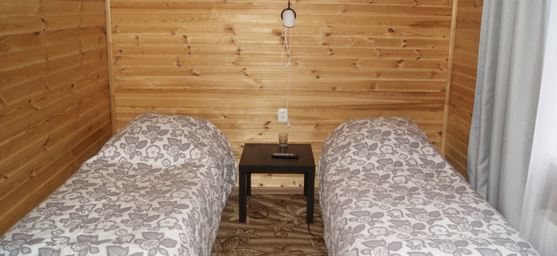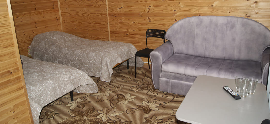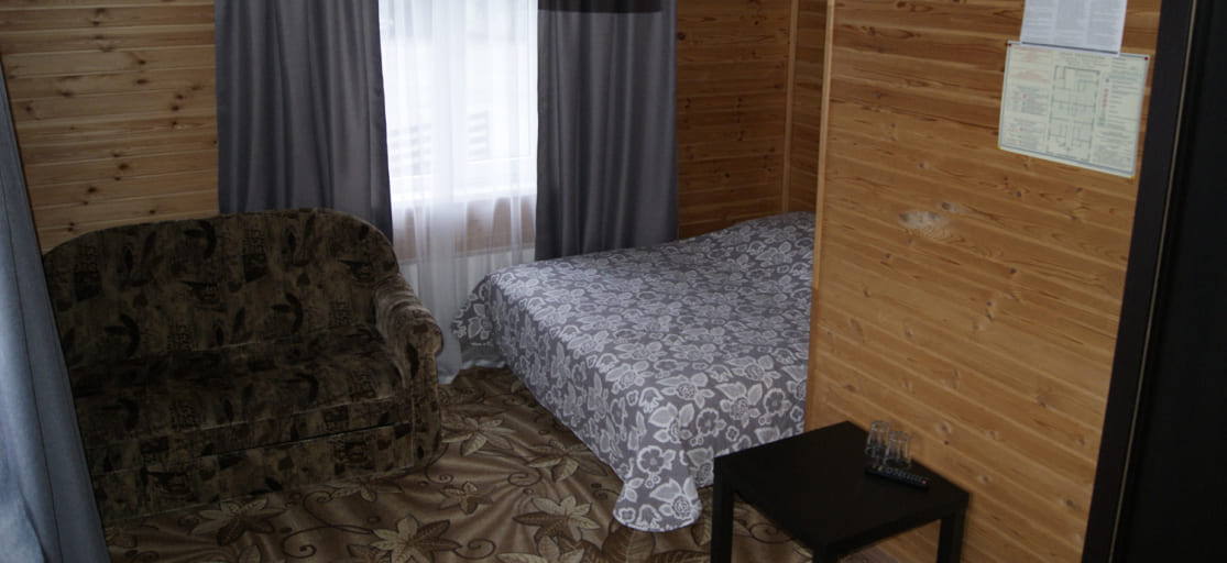 Однокомнатный номер: двуспальная кровать (или 2 односпальные кровати), журнальный стол, стулья, набор стаканов, телевизор.