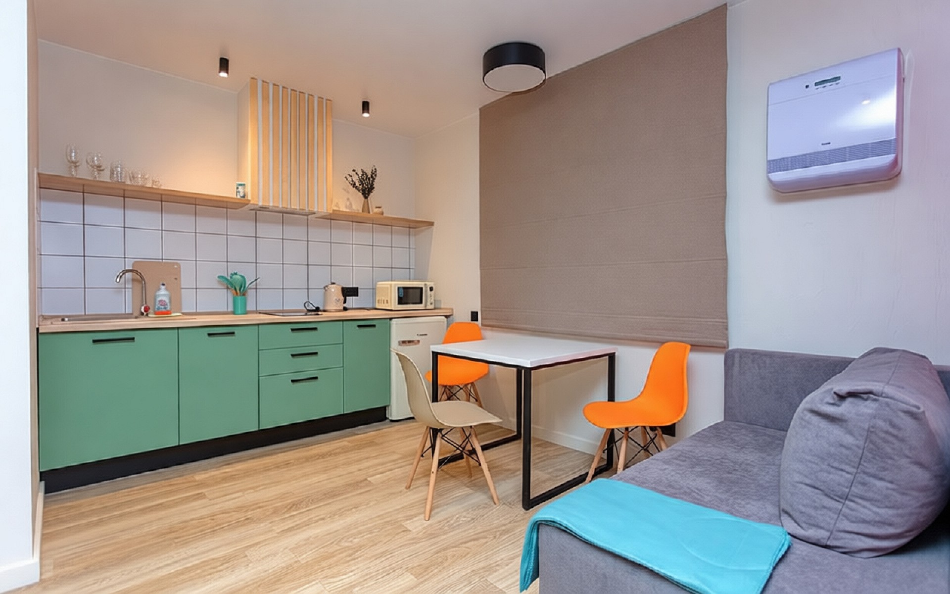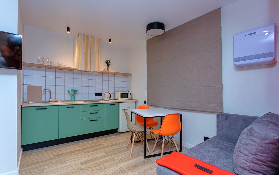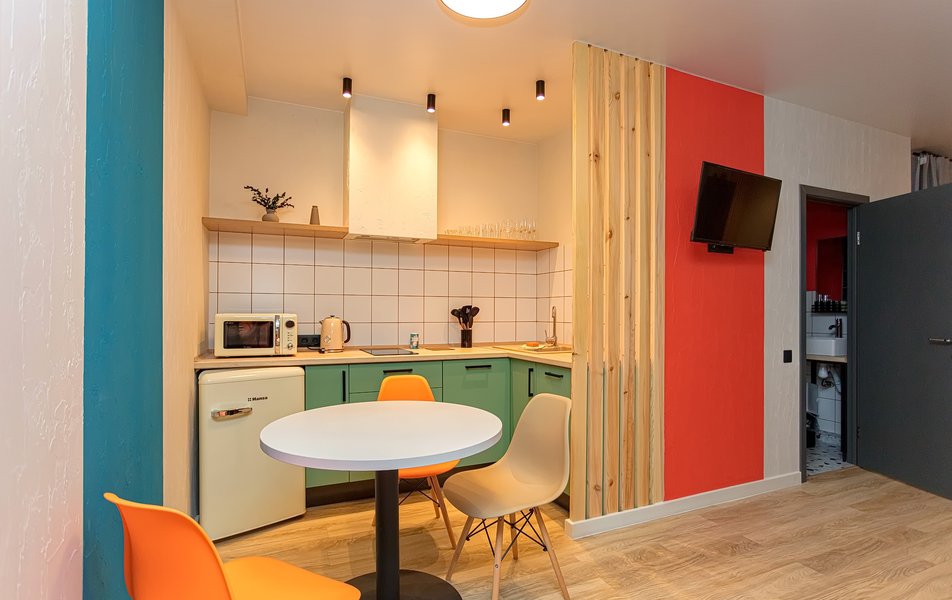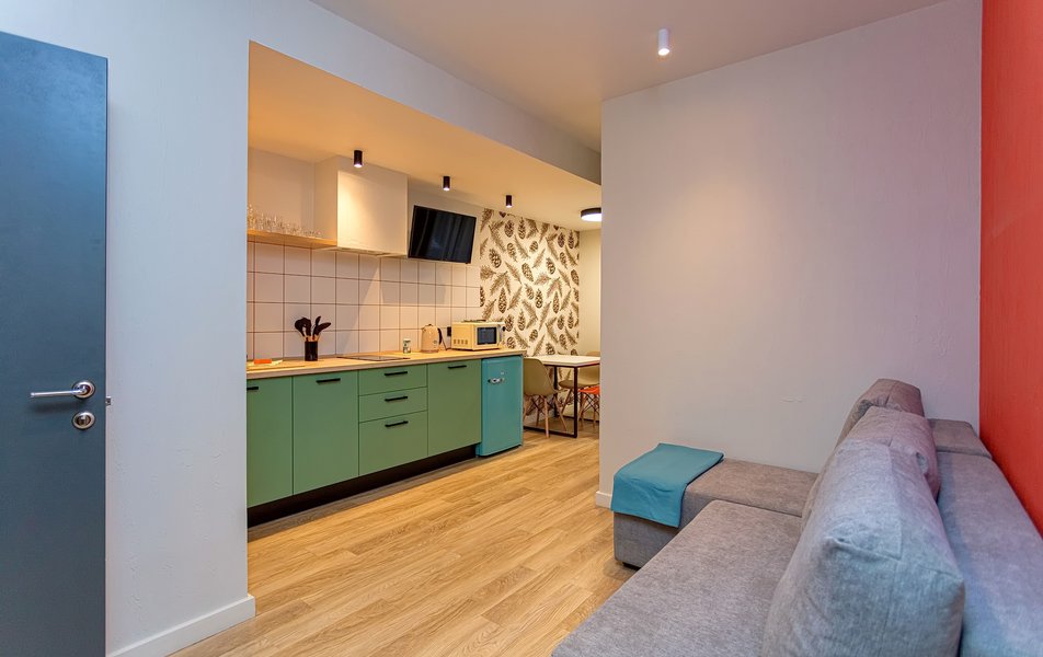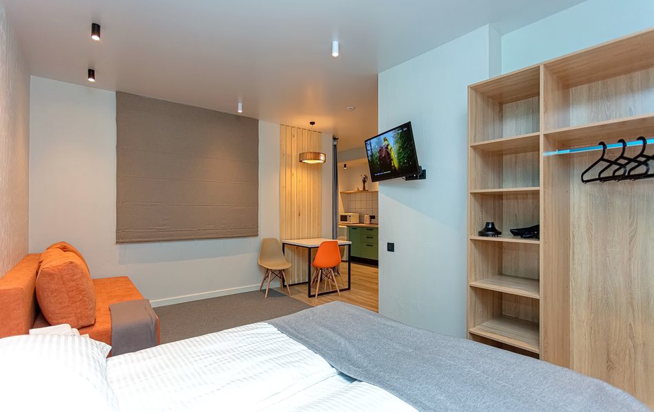 В номере: двуспальная кровать/2 односпальные кровати, прикроватные тумбочки, диван, раскладной диван, стол, стулья, шкаф, телевизор, wi-fi, электроплита, микроволновка, чайник, холодильник, посуда; санузел с душем.