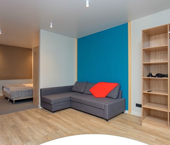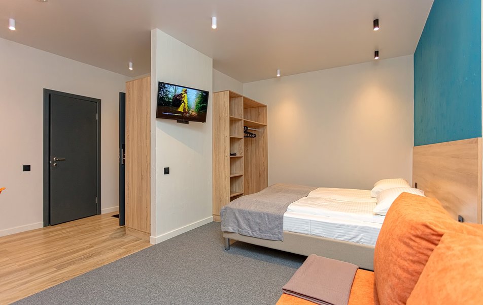 В номере: двуспальная кровать/2 односпальные кровати, прикроватные тумбочки, диван. раскладной диван, стол, стулья, шкаф, телевизор, wi-fi, электроплита, микроволновка, чайник, холодильник, посуда; санузел с душем.