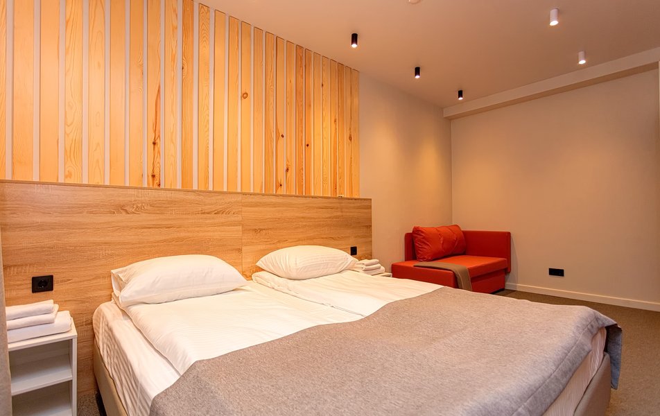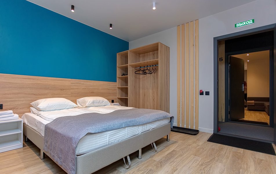 В номере: двуспальная кровать/2 односпальные кровати, двуспальная кровать, прикроватные тумбочки, 2 раскладных дивана, стол, стулья, шкаф, телевизор, wi-fi, электроплита, микроволновка, чайник, холодильник, посуда; санузел с душем.