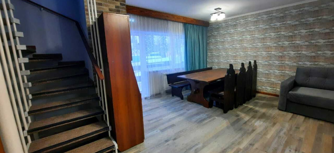 На 1-ом этаже гостиная (мягкая мебель, обеденный стол со стульями, ТВ, электрический чайник, холодильник, набор посуды, вешалка для одежды, зеркало.