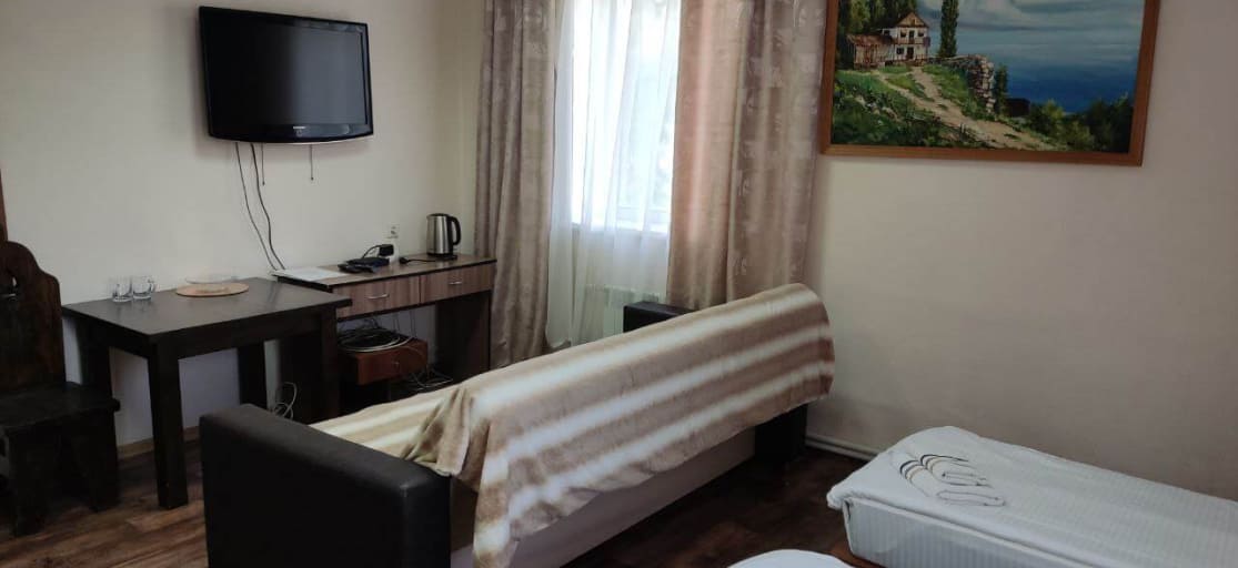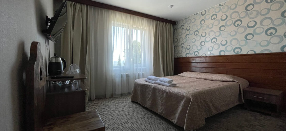 2-х спальная кровать состоящая из двух односпальных с возможностью разъединения, ТВ, кабельные каналы, туалетный столик, вешалка для одежды, плечики, электрический чайник, фен.