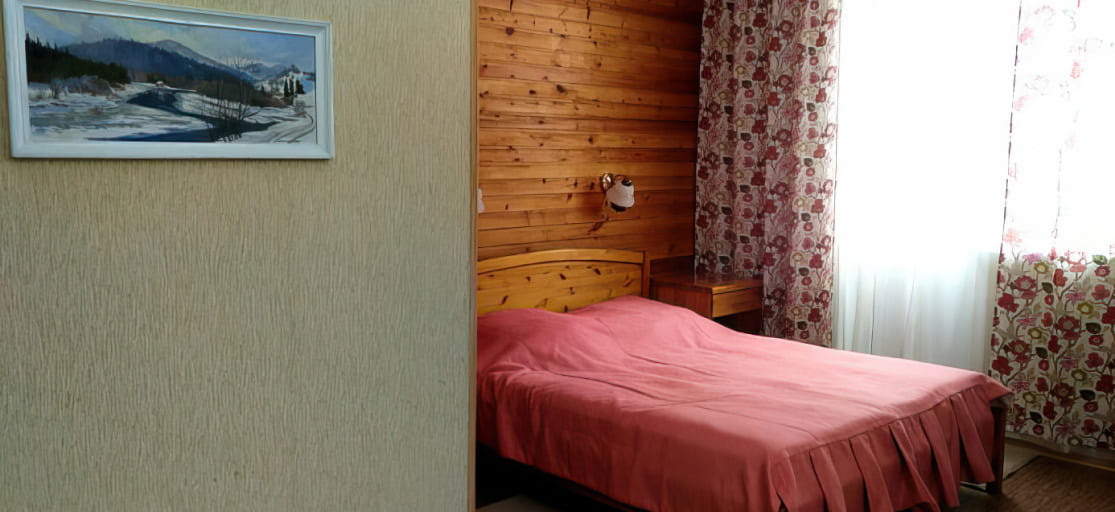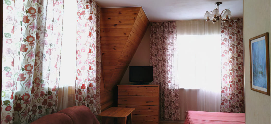 Однокомнатный номер: двуспальная кровать, диван, шкаф, стол, холодильник, чайник, телевизор. Санузел: душ, раковина, зеркало, унитаз.