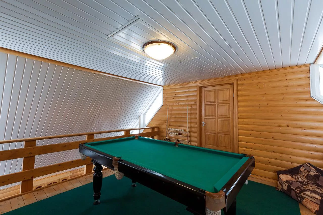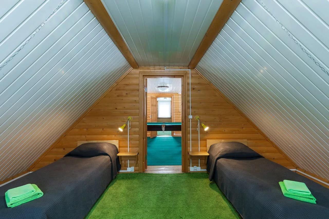 На втором этаже: 2 комнаты в каждой из которой находится 4 односпальных кроватей ; холл с бильярдом.