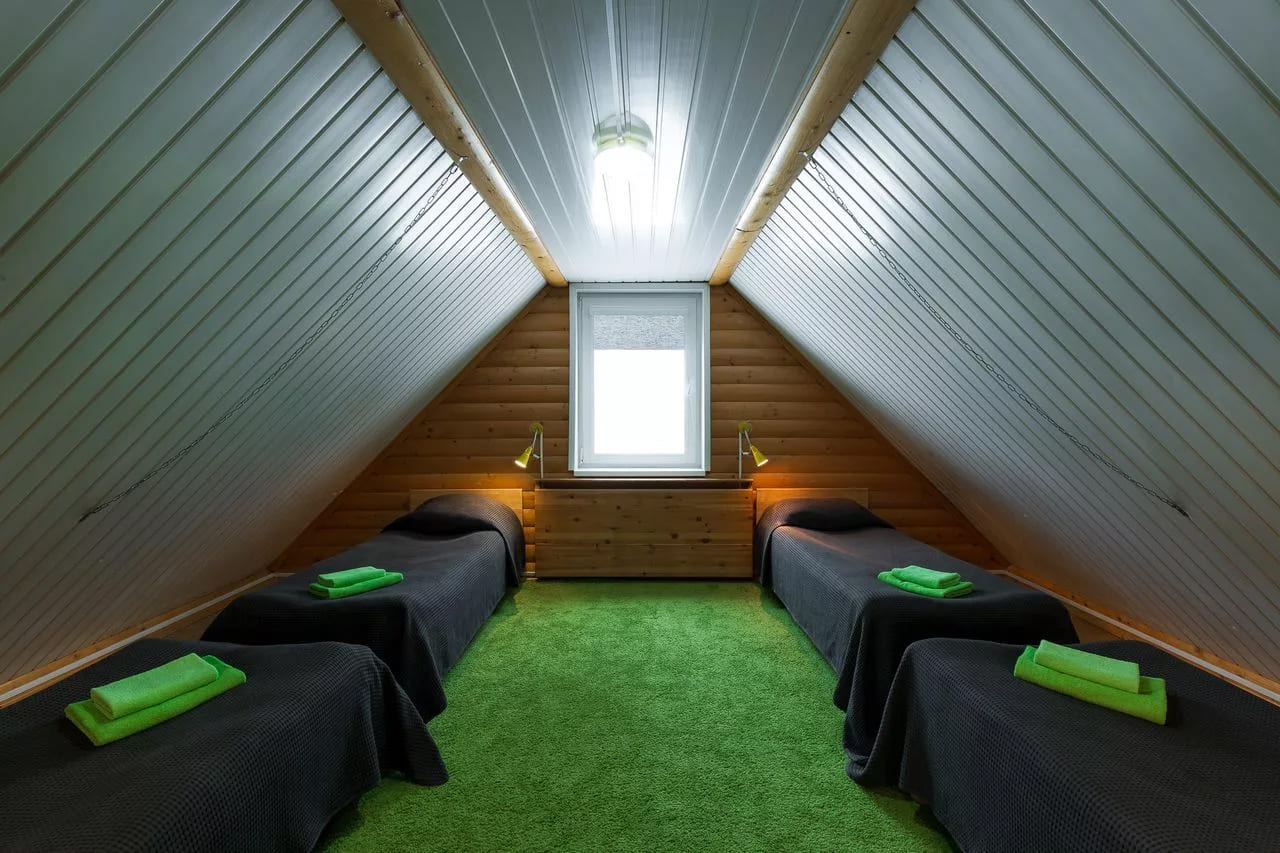 Номер в мансарде. В номере 6 спальных мест. 4 места на односпальных кроватях и 2 на двуспальной.