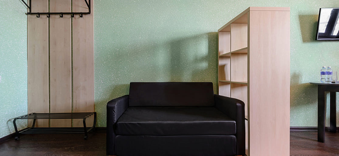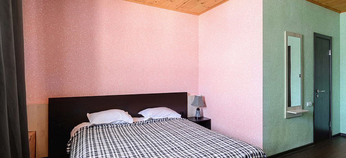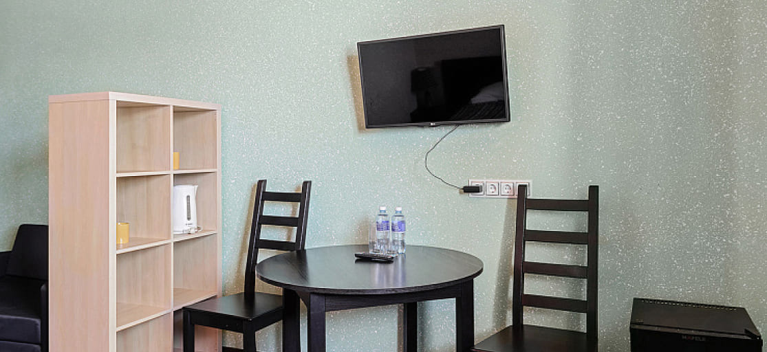 Однокомнатный номер. В номере: двуспальная кровать (размер: 1,8 х 2,0 кв.м., возможно раздвинуть), диван (большой или малый), телевизор, холодильник, стол, 2 стула, чайник, чайный набор посуды, фен. Площадь номера: 25 кв.м.