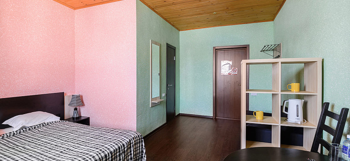 Однокомнатный номер упрощённой комплектации. В номере от одной до четырех двухъярусных кроватей. В каждом номере свой санузел. В санузле: унитаз, душ, раковина, зеркало. В гостинице имеется бойлер с горячей водой и микроволновая печь со свободным доступом 24 ч/сут. Площадь номеров: 19-39 кв.м.