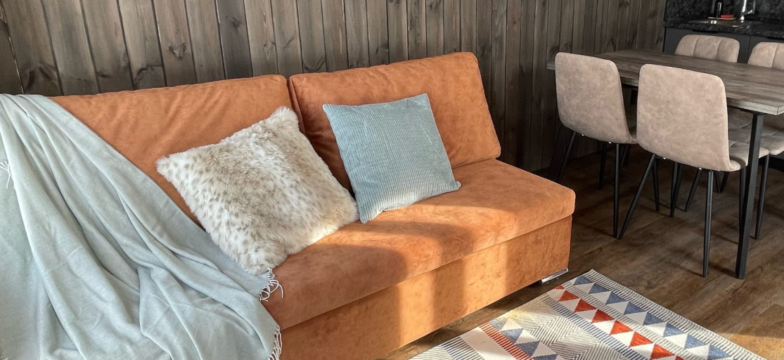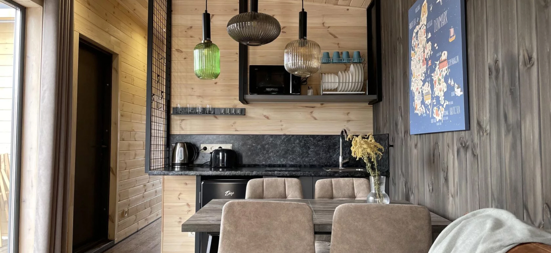 Современные гостевые дома с панорамными окнами, дизайнерским ремонтом оснащены всем необходимым для комфортного отдыха. В распоряжении гостей спальня с большой кроватью, с/у и гостевая комната с кухонной зоной. Кухня оборудованна варочной плитой, микроволновой печью, холодильником, чайником, тостером и посудой.