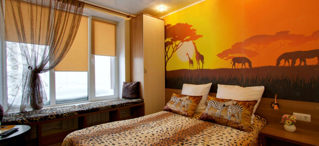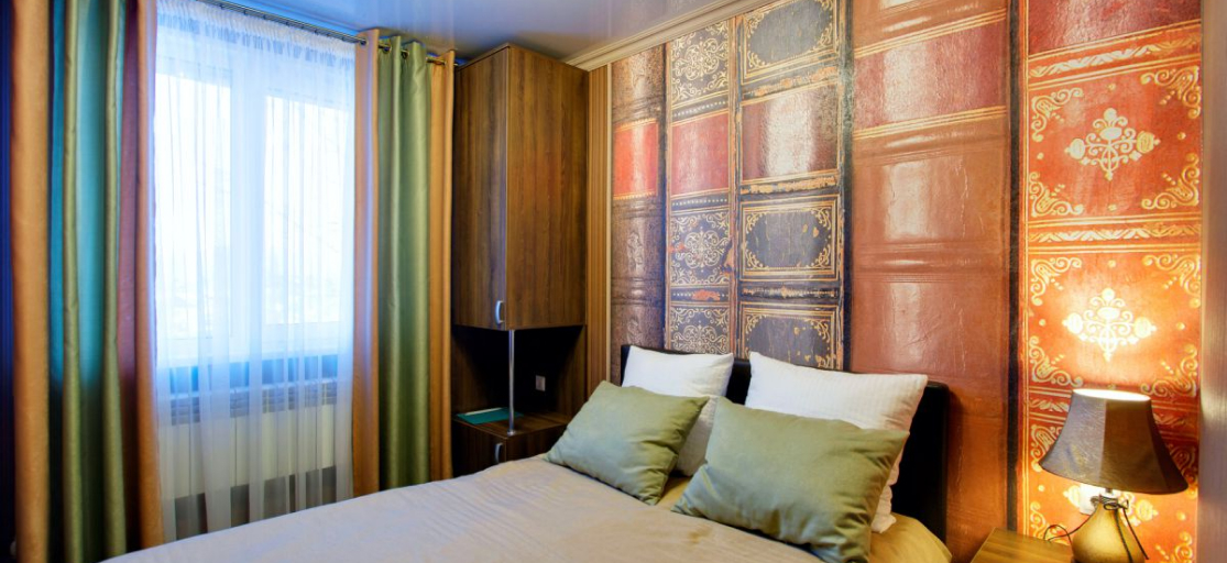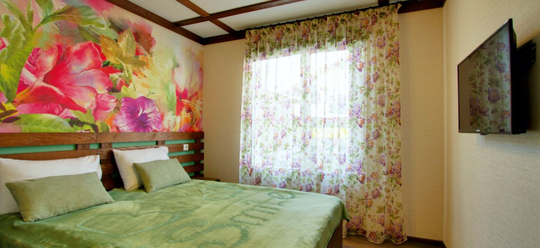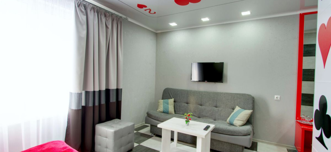 Однокомнатный номер 22 м. кв., расположенный на первом этаже. Разделен перегородкой на 2 зоны, спальная комната и гостиная. В состав спальной комнаты входит двух спальная кровать с ортопедическим матрасом, 2 тумбочки. В гостиной раскладной диван, журнальный столик, шкаф-купе, стеновая панель для верхней одежды, мягкий топчан у окна, ЖК телевизор 32 дюйма. На полу постелен ковролин. Имеется 2 санузла по 3 м. кв. в одном раковина, душ, в другом тумба с раковиной, шкаф-зеркало, унитаз, фен, комплект полотенец (3 шт), шампунь, гель для душа.