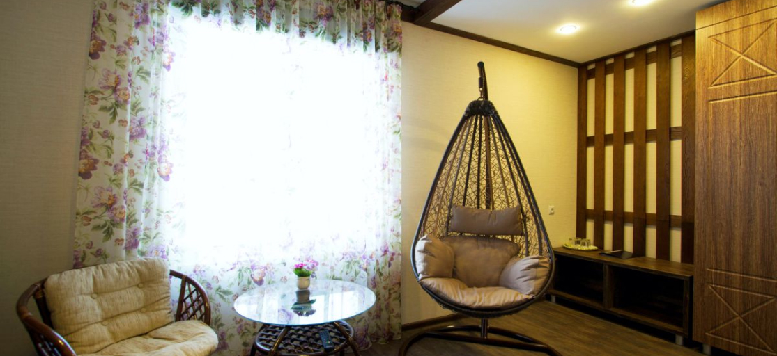 Двухкомнатный номер 29 м.кв. Расположен на втором этаже. Имеется гостиная и спальная комната, разделенная на 2 зоны. В состав гостиной входит раскладной диван, журнальный столик, шкаф, стеновая панель для верхней одежды, мягкий топчан у окна, ЖК телевизор, на полу постелен ковролин. В спальной комнате двух спальная кровать с ортопедическим матрасом, 2 тумбочки, ЖК телевизор 32 дюйма. И зона с туалетным столиком, пуфиком и 2–мя шкафами. Санузел 3 м.кв.: душ, раковина, унитаз, фен, комплект полотенец (3 шт), шампунь, гель для душа.