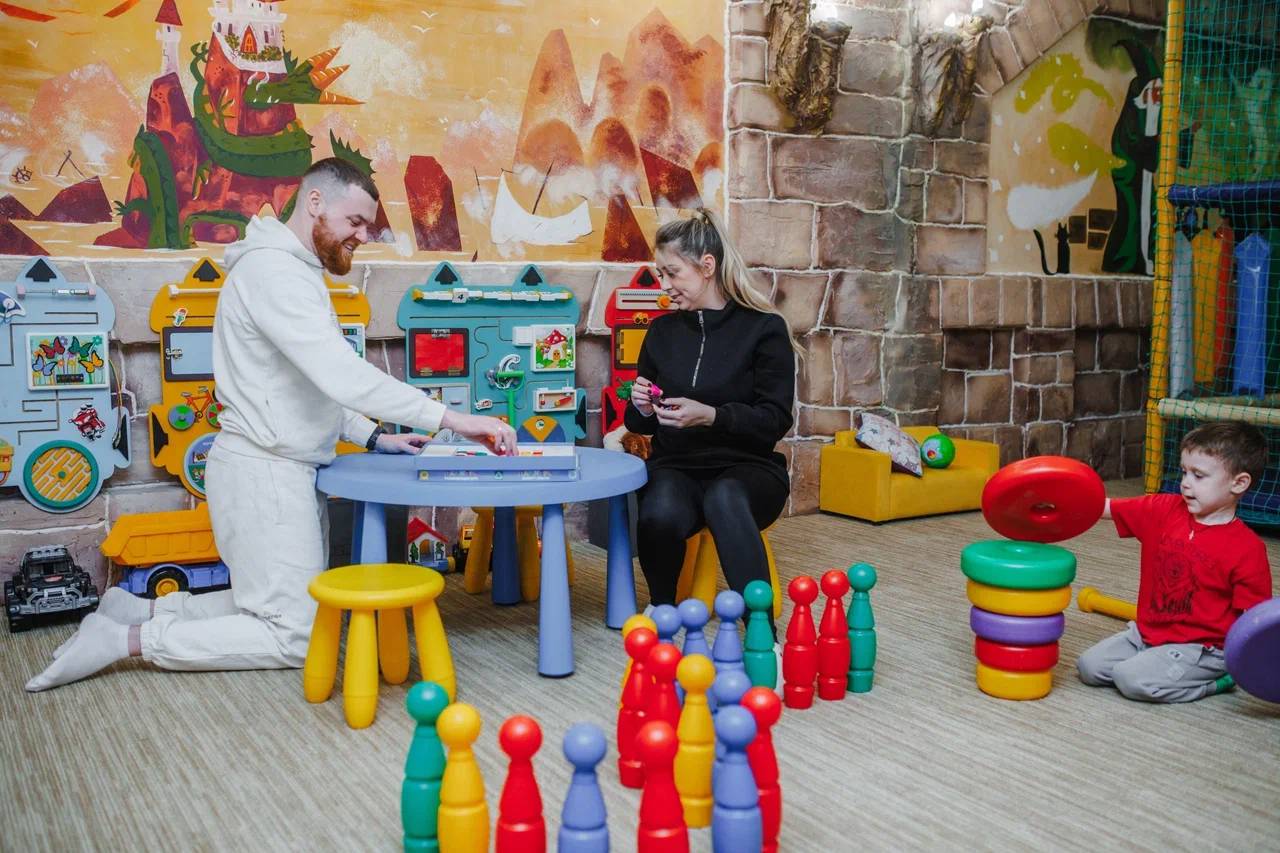 Игровая комната с игровым лабиринтом, мягкими модулями. Здесь есть есть наборы для рисования, познавательные и развивающие настольные игры, пазлы, детский городок, игрушки.