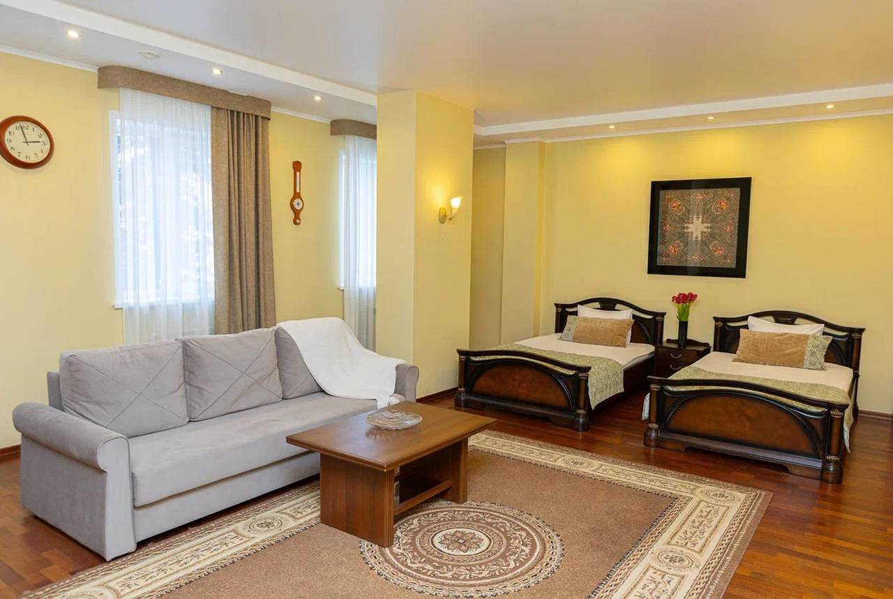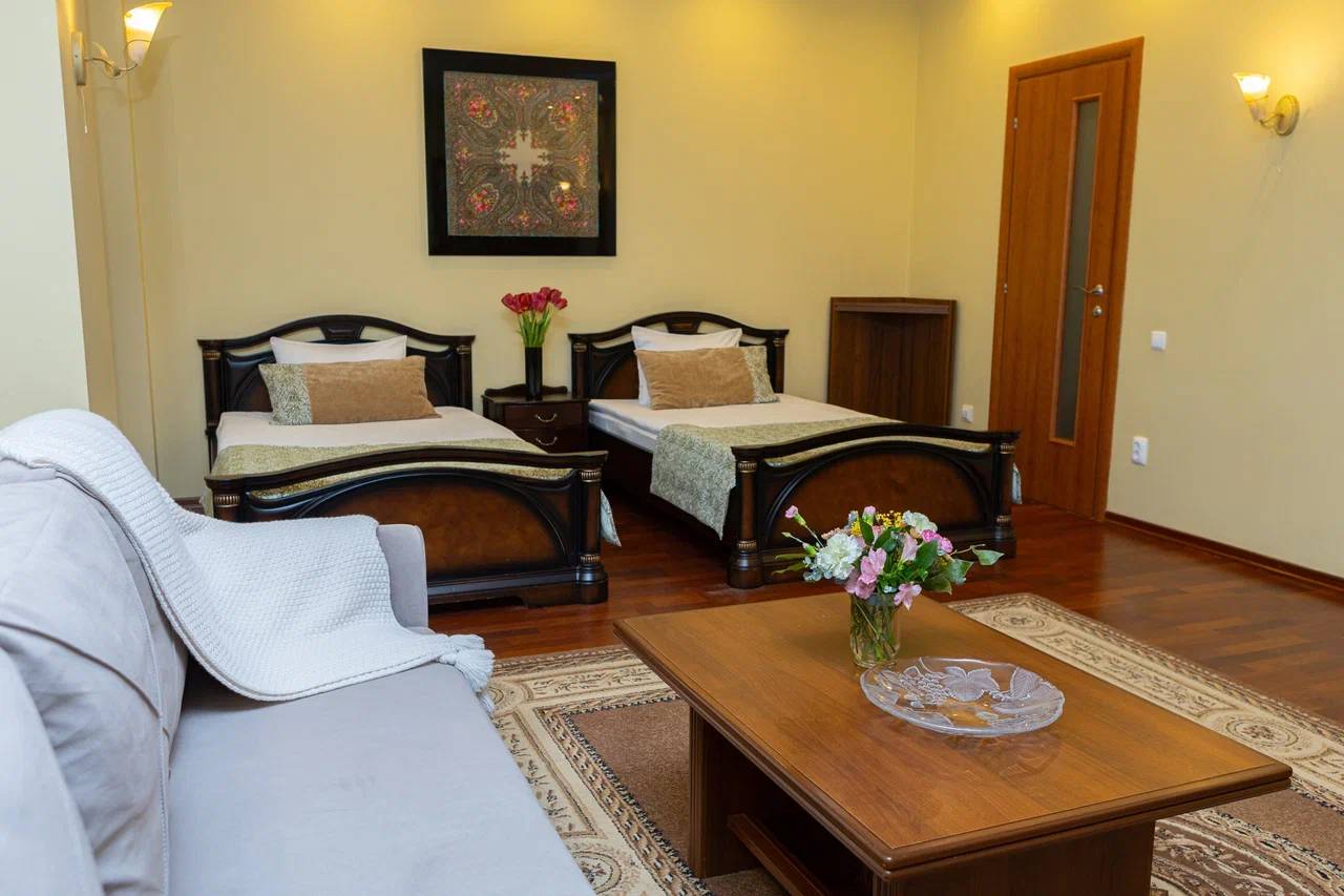 Номера категории Стандарт Семейный отлично подходят для семейного проживания или проживания небольшой компании друзей. Однокомнатный номер с двумя полутороспальными кроватями, с возможностью дополнительного размещения до 2-х взрослых на раскладном диване, душевой комнатой и помещением для сушки верхней одежды.