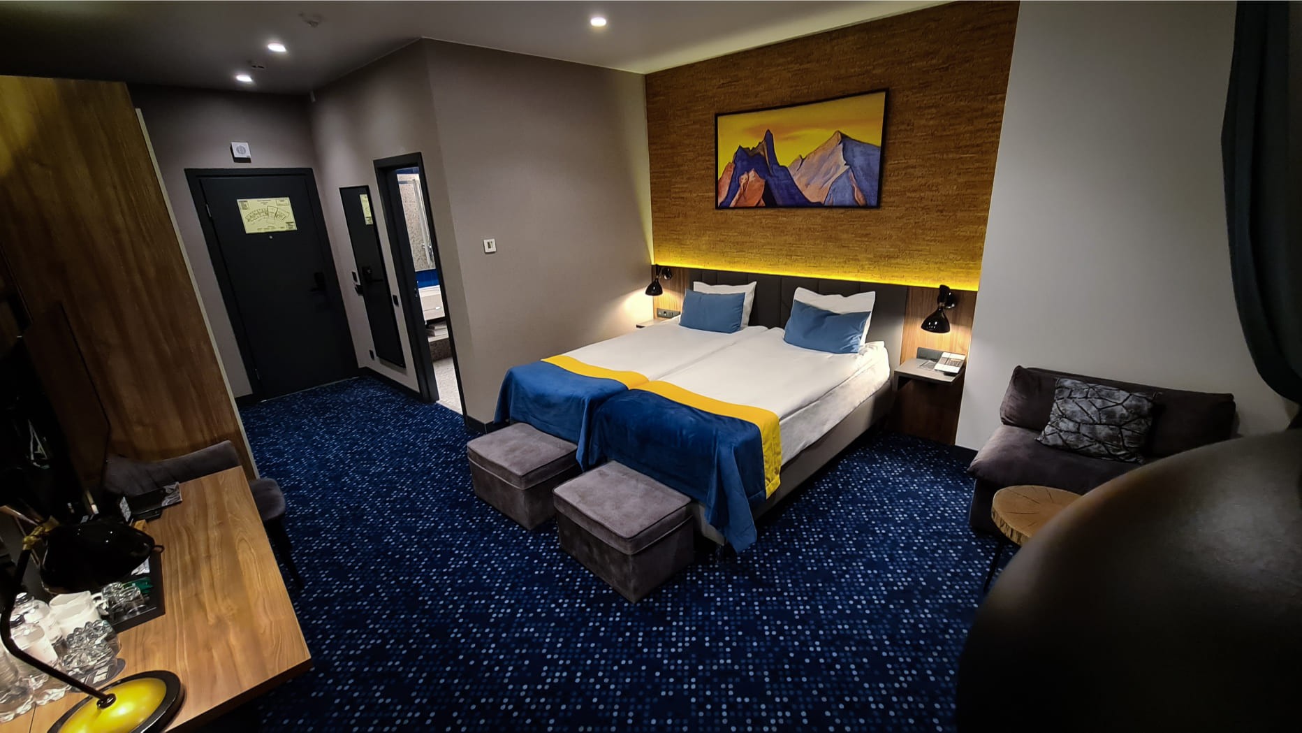 Номер выполнен в современном Loft-стиле и оснащен всем необходимым для комфортного пребывания: мини-бар, сейф, теплый пол, сушилка для ботинок, базовые комплекты гигиенических средств и пр. Есть возможность разместить доп. место. В номере присутствует регулировка температуры с помощью системы "умный дом".
