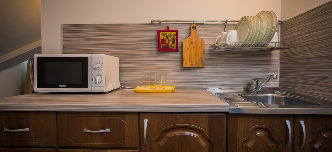 Однокомнатный номер-студия с единым пространством, разделенным на зону кухни и спальни; в спальне: одна двуспальная кровать, раскладной диван, стол и стулья, гардероб, телевизор, телефон; в кухонной зоне: холодильник, микроволновая печь, чайник, набор посуды, раковина, сушилка для посуды, набор столовых приборов; в ванной комнате: душевая кабина раковина с зеркалом, санузел и фен.