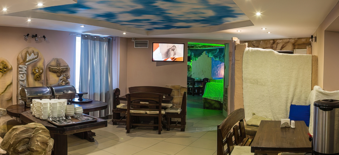 На первом этаже гостиницы для посетителей работает ресторан «Зодиак», рассчитанный на 85 гостей. Завтраки и ужины в ресторане осуществляется по системе «шведский стол» и входят в стоимость проживания. Так же возможна доставка блюд из меню ресторана и барной продукции в номера. На этом же этаже находится сауна с просторной комнатой для отдыха и бассейном. В холлах гостиницы на этажах размещены бильярдный стол и стол для настольного тенниса, где гости могут провести свободное от катания время.