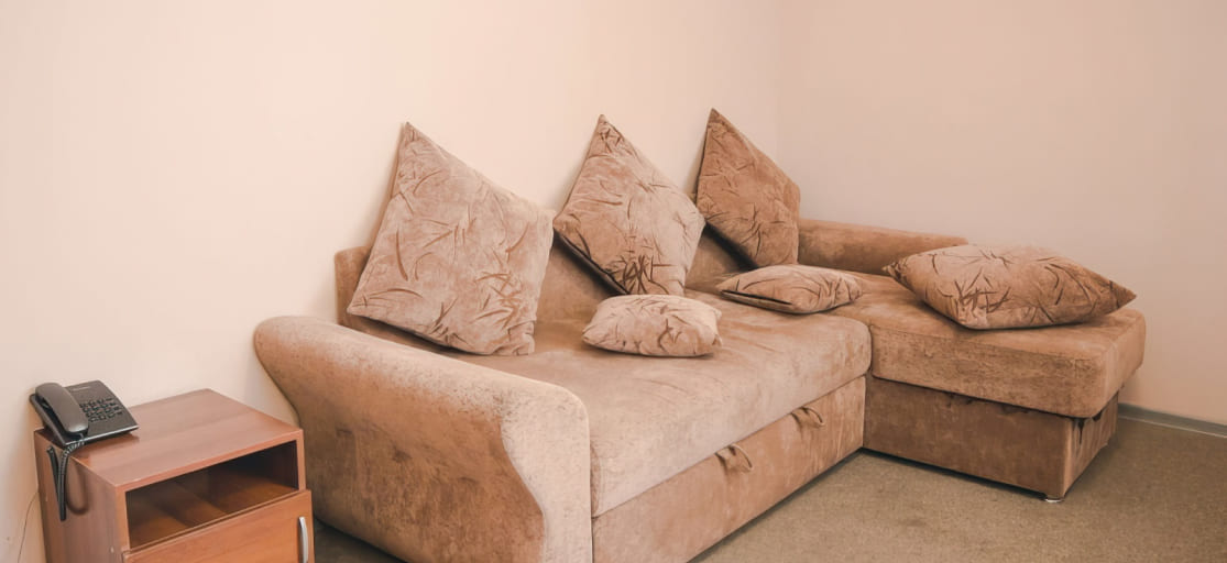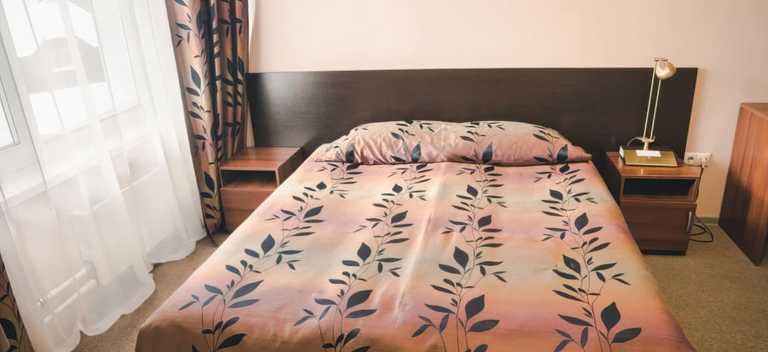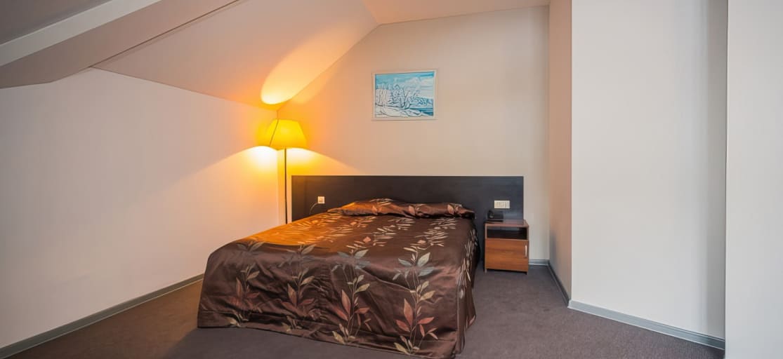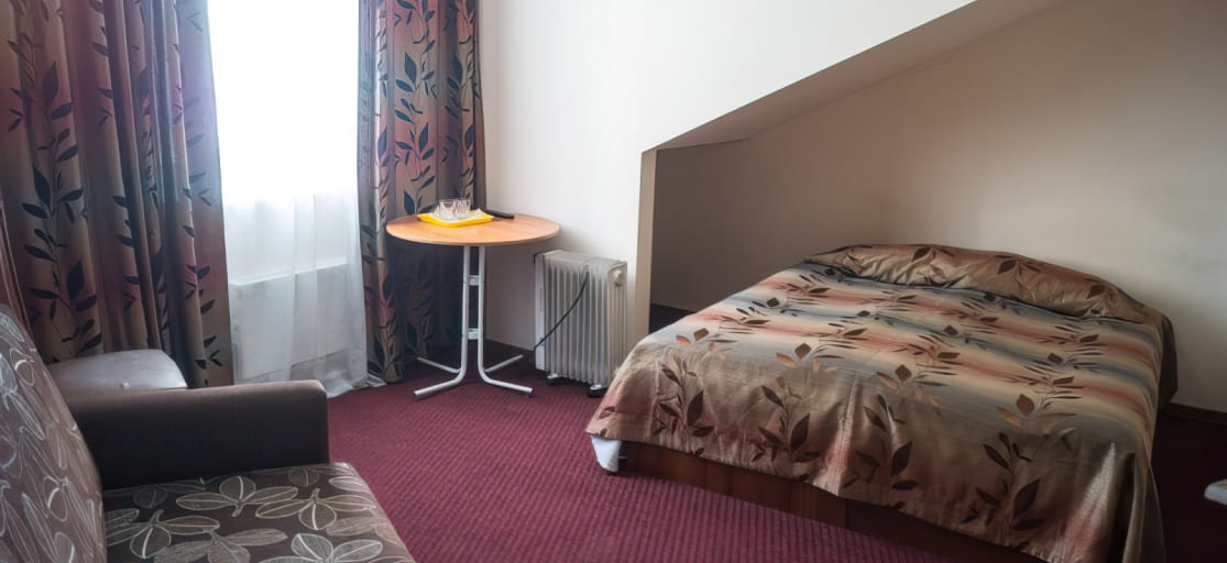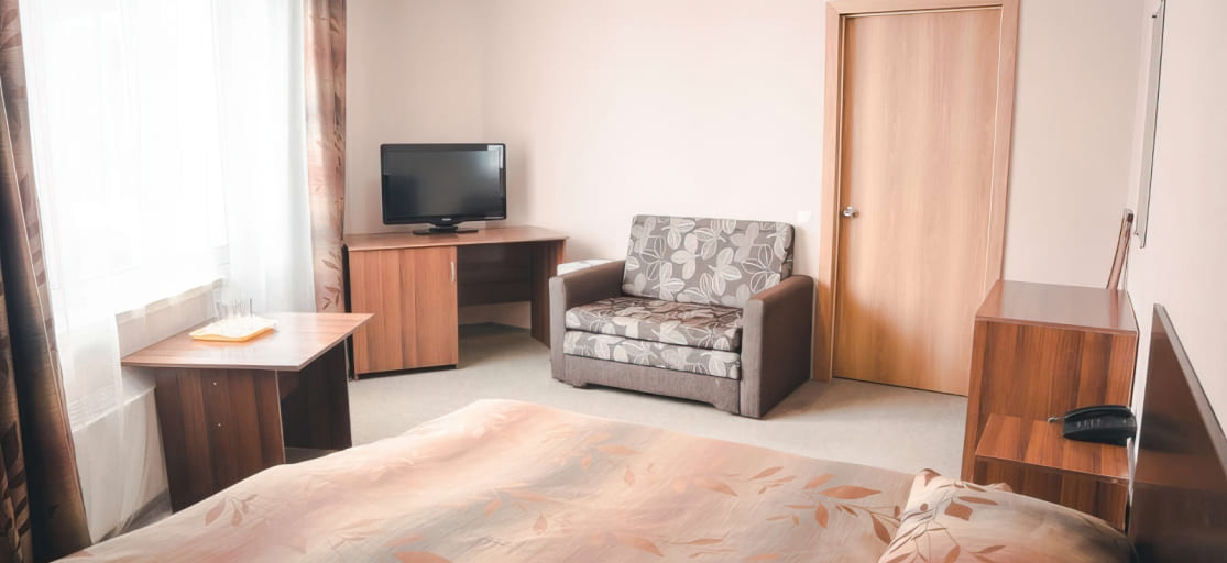 Однокомнатный номер: 1 двуспальная или 2 односпальные кровати, раскладной диван, стул, телевизор, телефон, душ, туалет, фен.
