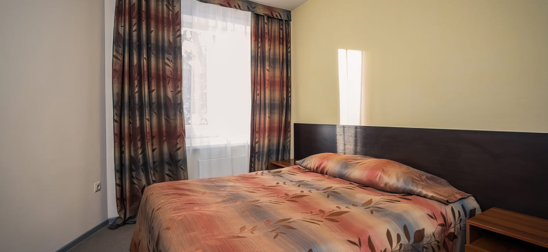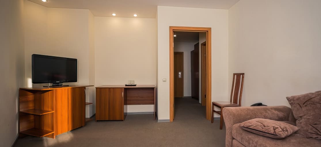 Двухкомнатный номер (раздельные комнаты): 1 двуспальная кровать, стол с выдвижными ящиками и комод в спальне; раскладной диван, журнальный столик, телевизор, телефон в гостиной; душ, туалет, фен.