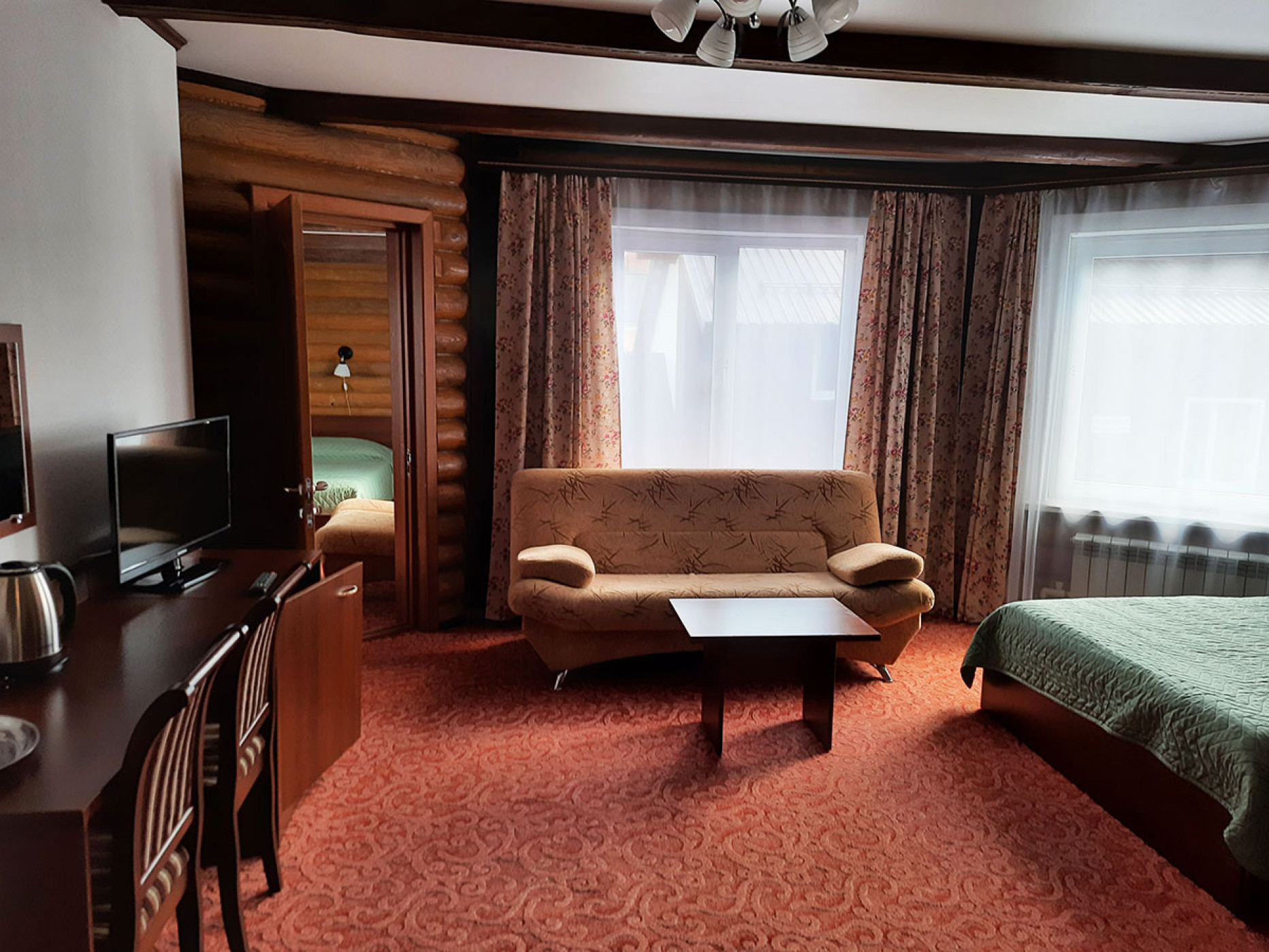 Шкаф, стол, мягкая мебель, багажная полка, ТВ, журнальный столик, холодильник, халаты, фен; 2-сп. кровать.