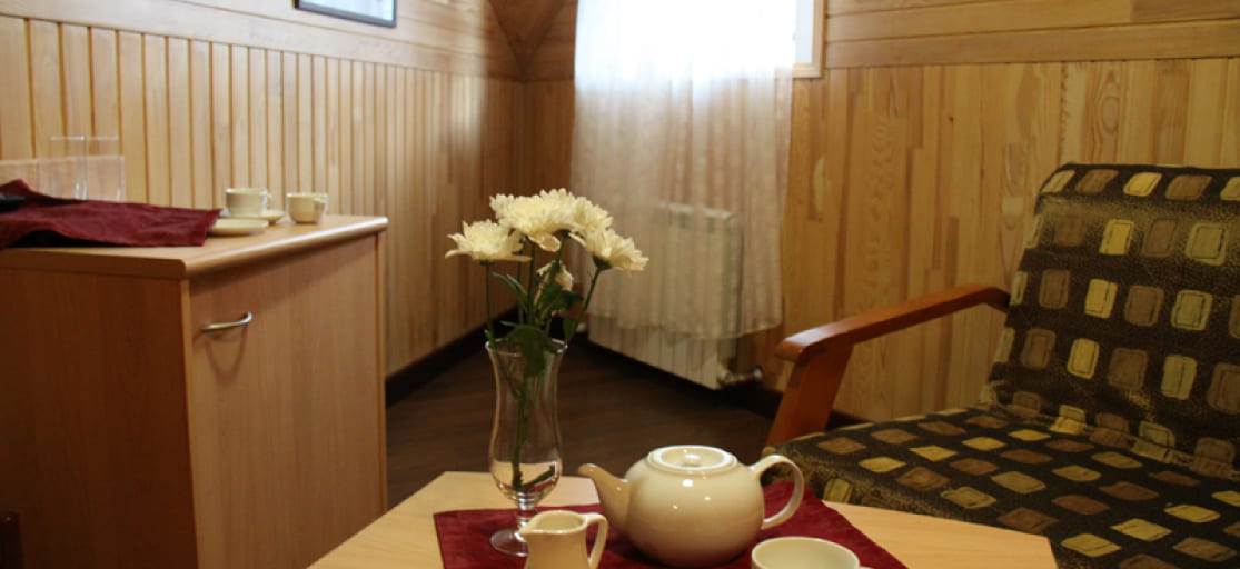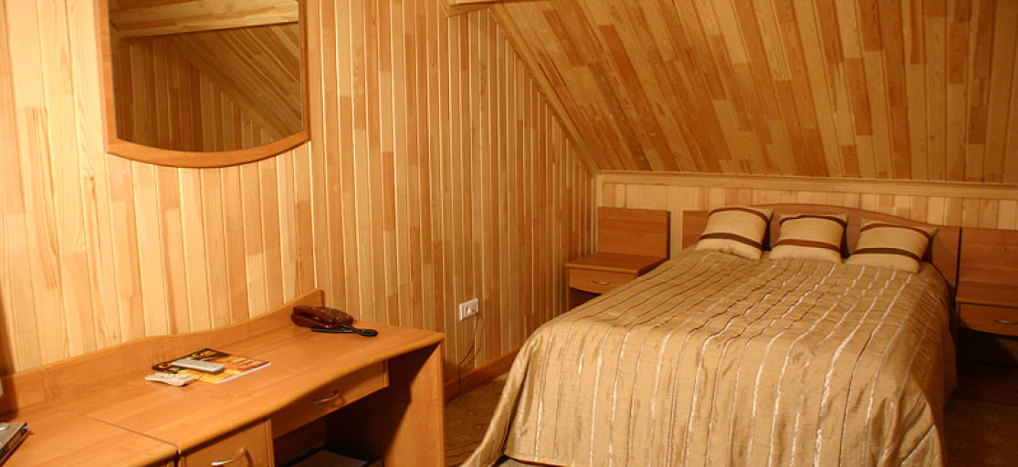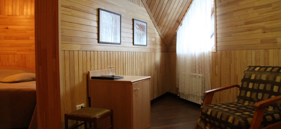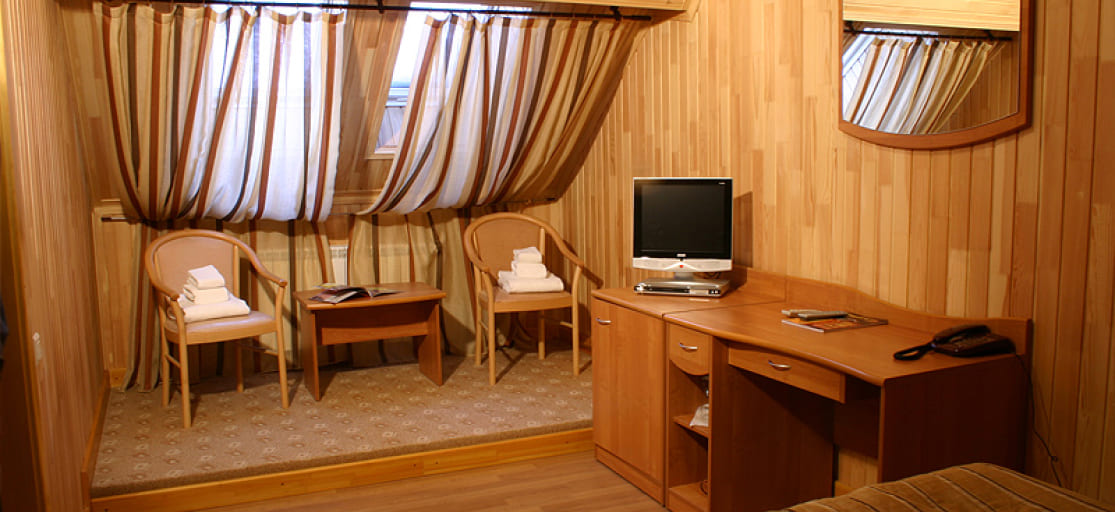 Несмотря на то, что в номере всего одна комната, в которой расположены кровать, шкаф-купе, стол, телевизор, номер во флигеле пользуется популярностью. Ведь он расположен не в основном корпусе гостиницы, а в отдельном здании, сюда имеется отдельный вход.