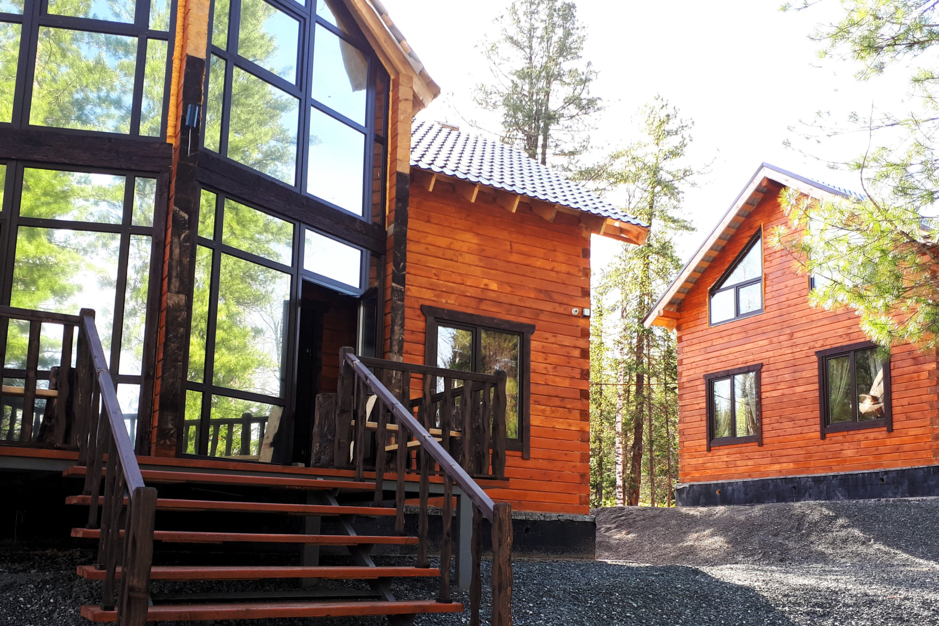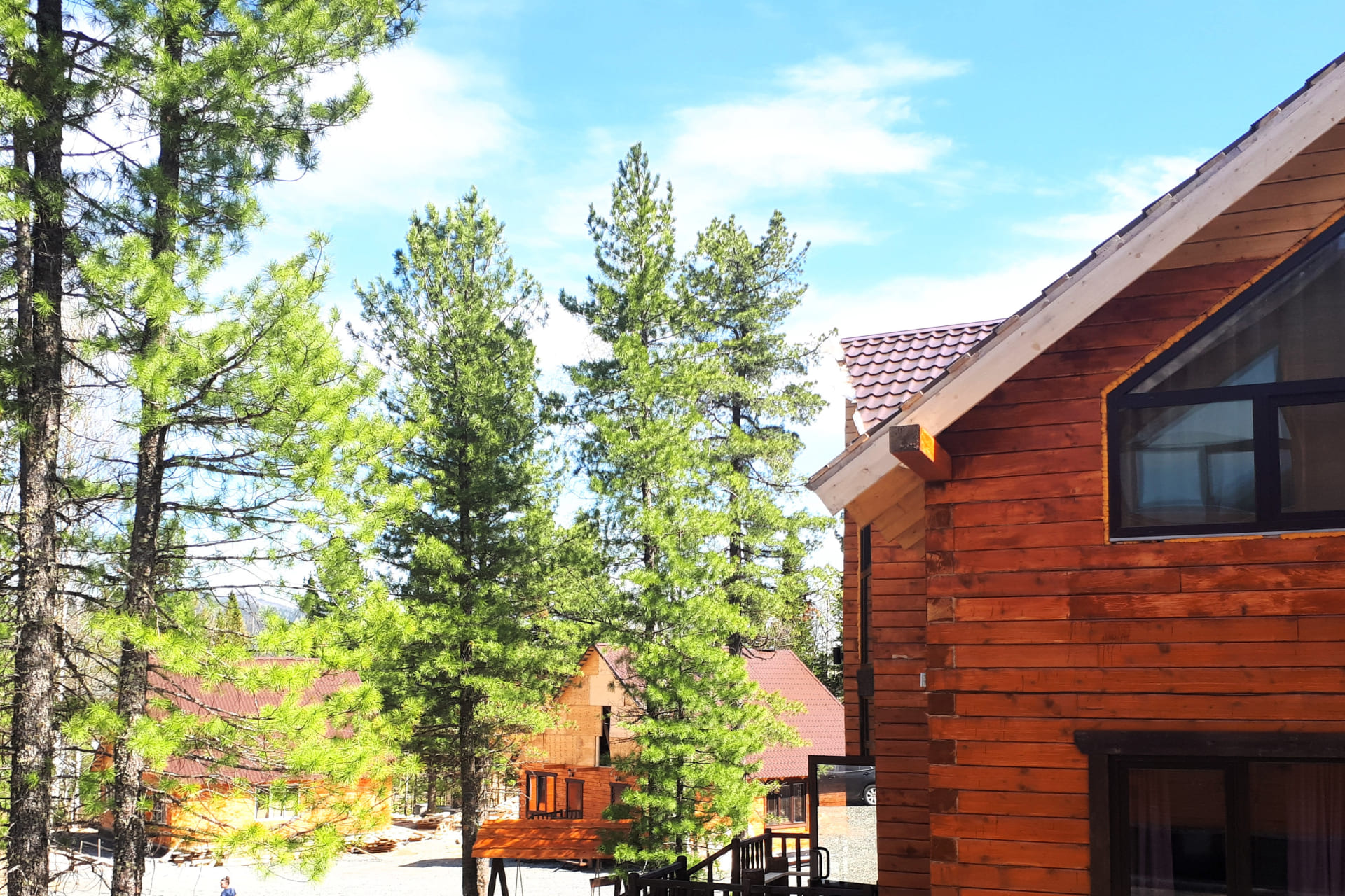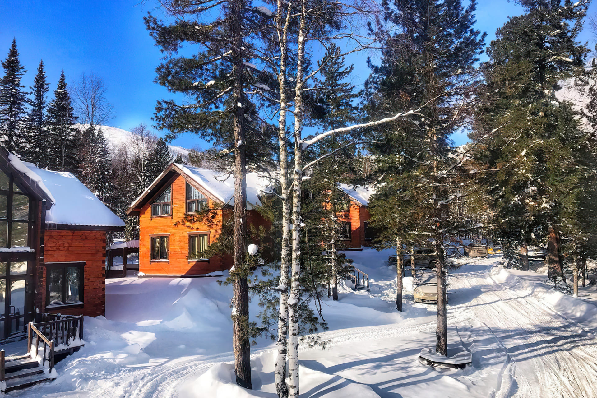 Размещение: На территории расположены 3 двухэтажных коттеджа, которые разделены на 2 половины, вмещающие компанию от 6 до 8 человек, каждая из которых имеет свой отдельный вход, место для размещения горнолыжного инвентаря, кухню-гостиную, 2 сан.узла с душевой кабиной, 3 спальни на втором этаже (2 спальни с 2-х спальными кроватями, 1 спальня с двумя 1-спальными кроватями), балкон.