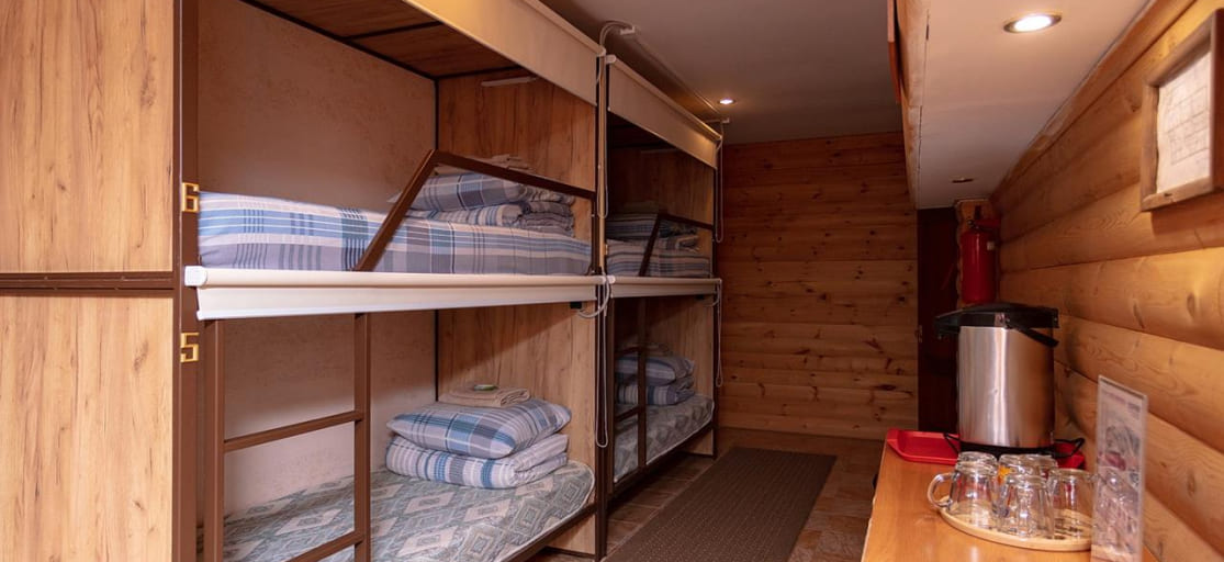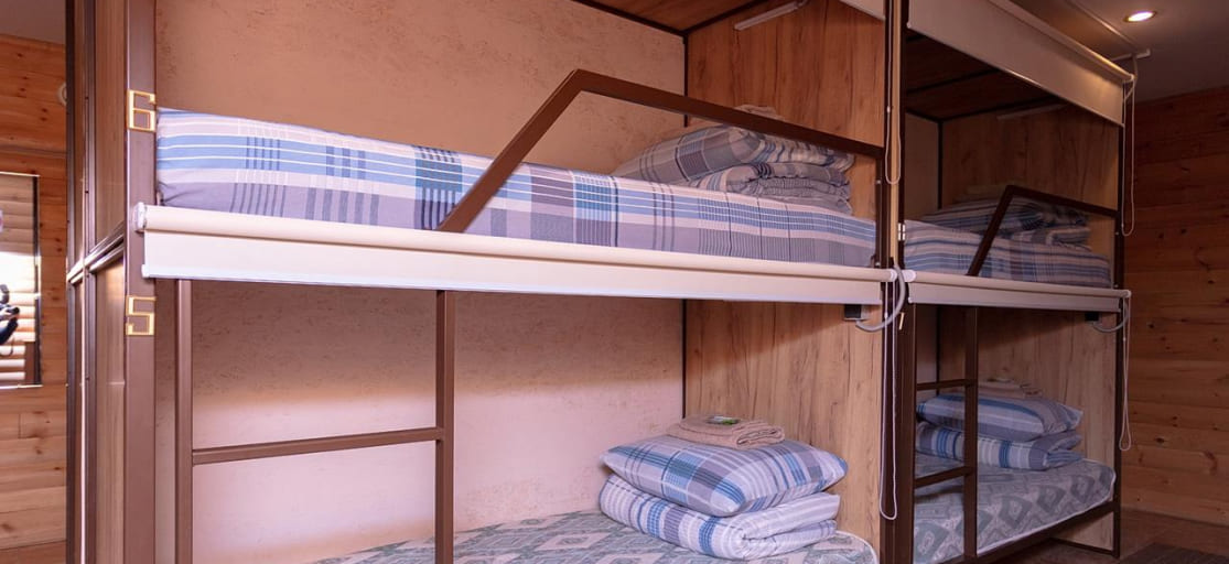 Номер в цокольном этаже. В номере четыре двухъярусные кровати капсульного типа, две душевые, туалет, зона отдыха (стол, диван, кресла), холодильник -
