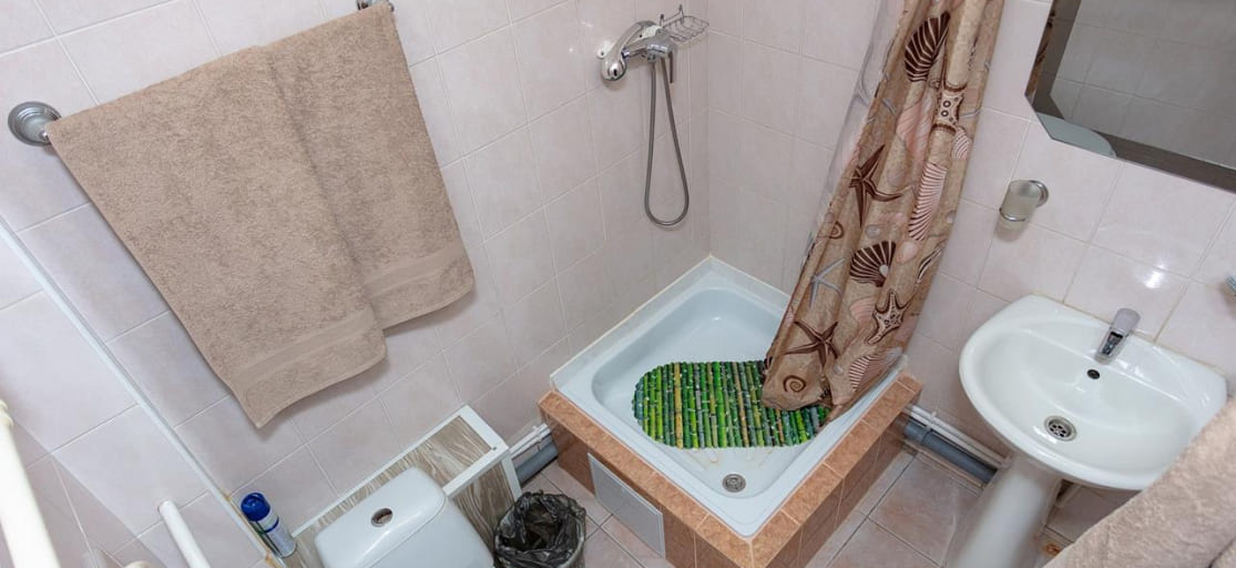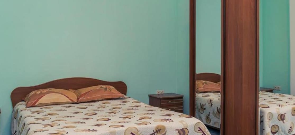 Однокомнатный номер: двуспальная кровать, раскладной диван, тумба, телевизор, холодильник, столик, стол, стулья, шкаф или полка для одежды. В санузле: душ, раковина, зеркало, унитаз -