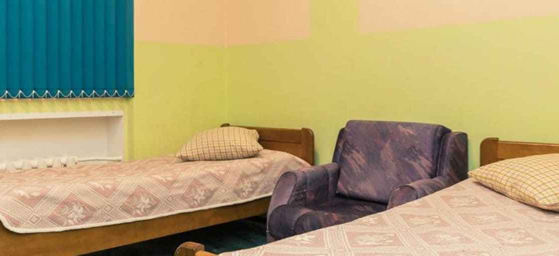Двухкомнатный номер в цокольном этаже гостиницы. Есть небольшое окно, но преобладает искусственный свет. В первой комнате расположены две односпальные кровати, во второй комнате двухъярусная кровать и диван. В номере: туалет, душ, телевизор, холодильник -