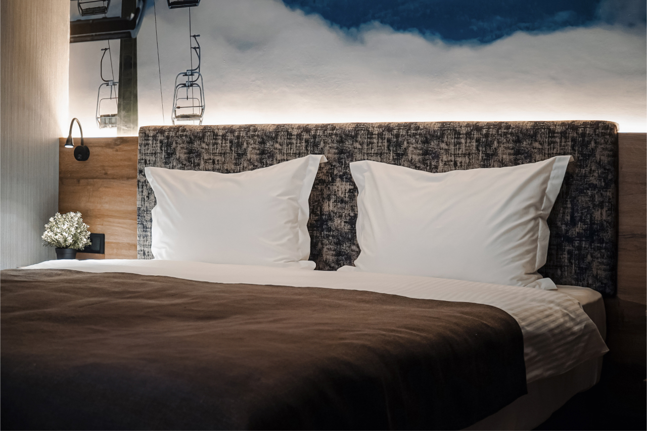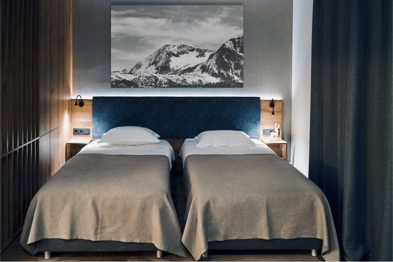 Номерной фонд отеля составляют однокомнатные апартаменты и двухкомнатные апартаменты, а с недавних пор еще и роскошные двухуровневые апартаменты на 11-м этаже, откуда открывается обзор практически на весь Шерегеш. Во каждых апартаментах есть все необходимое для отдыха: обеденная зона, бытовая техника, удобная мебель, телевидение и качественная уборка. На первом этаже – ресторан концептуальной кухни, сушилка для снаряжения и игровые автоматы для взрослых и маленьких гостей, а на последнем – wow.спа с продуманными релакс-зонами и панорамным видом на горы.