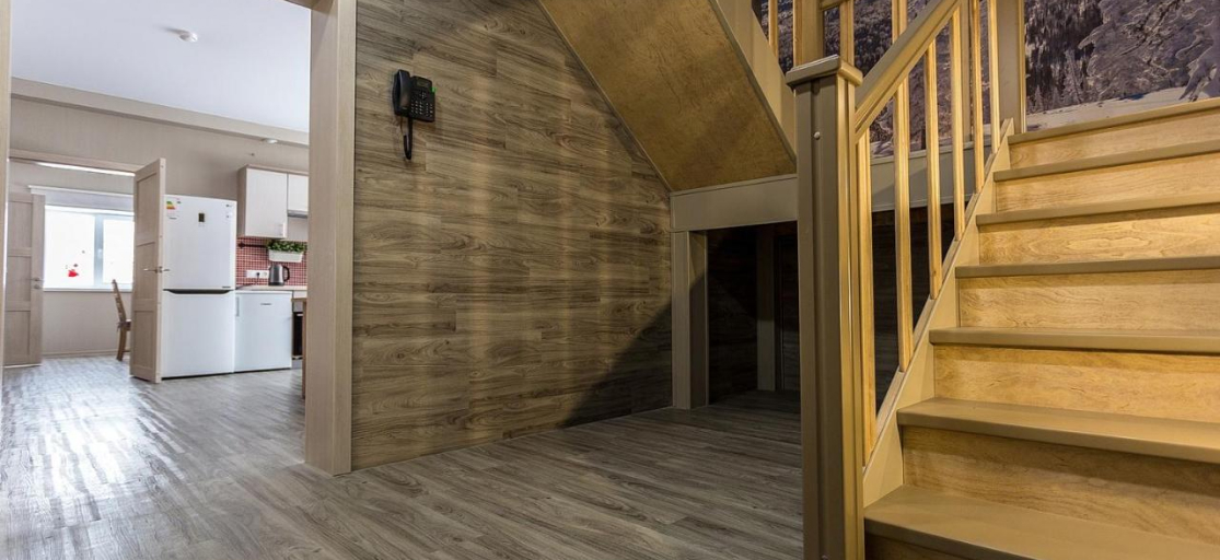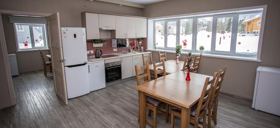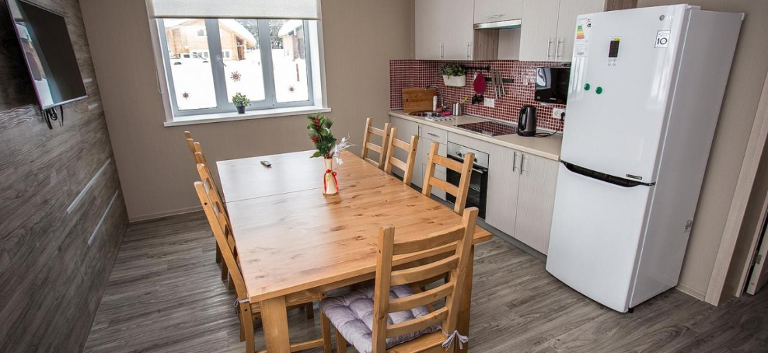 В номере: двуспальная и две односпальных кровати; ТВ; кухонная зона; наличие посуды; микроволновая печь; электрическая или газовая плита; шкаф; набор полотенец; фен; тумбочка; обеденный столик; стул.