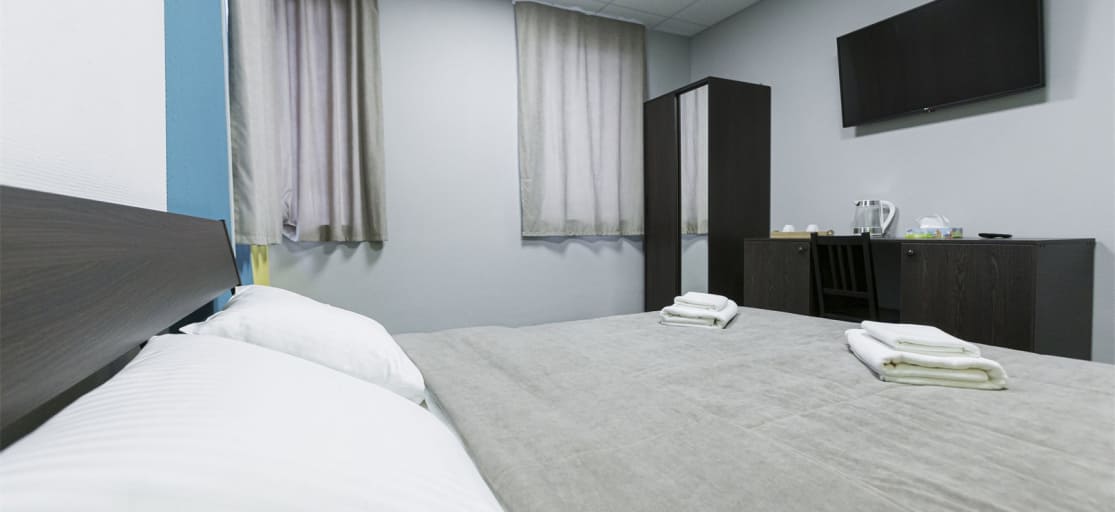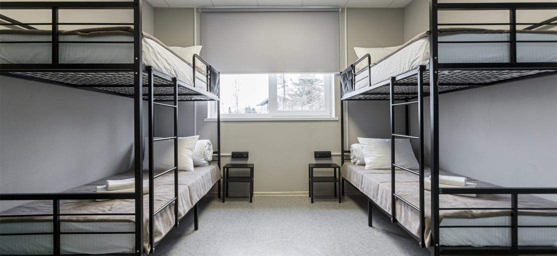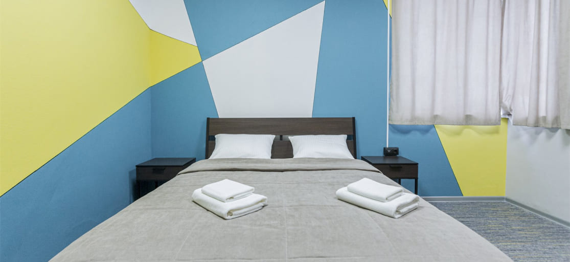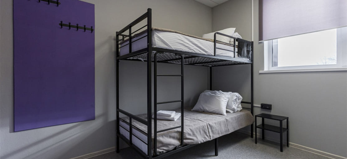 Однокомнатный номер: две двухъярусные односпальные кровати с ортопедическими матрасами, вешалка, полки для хранения мелочей. Теплые полы, кондиционер.