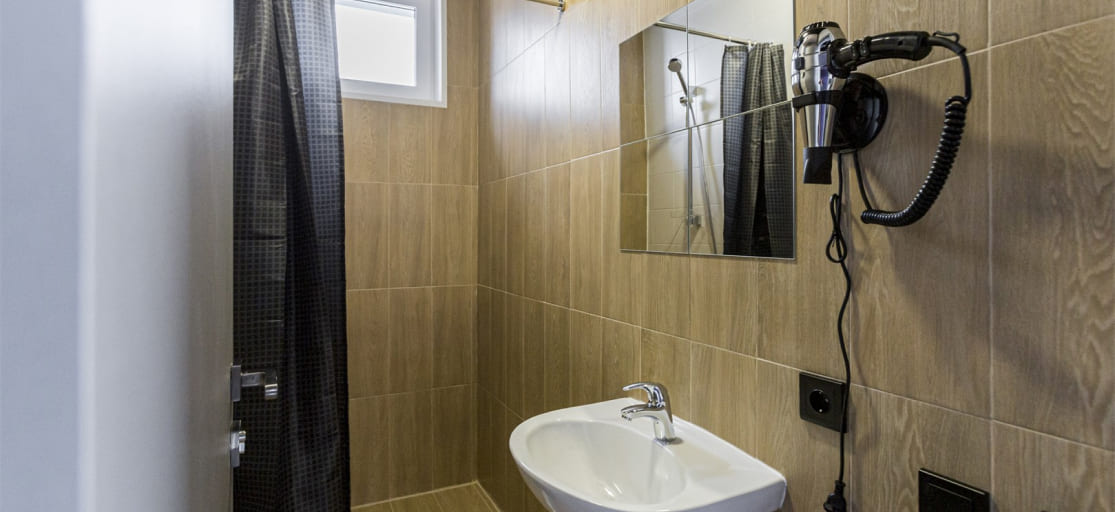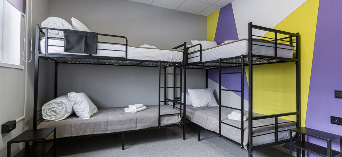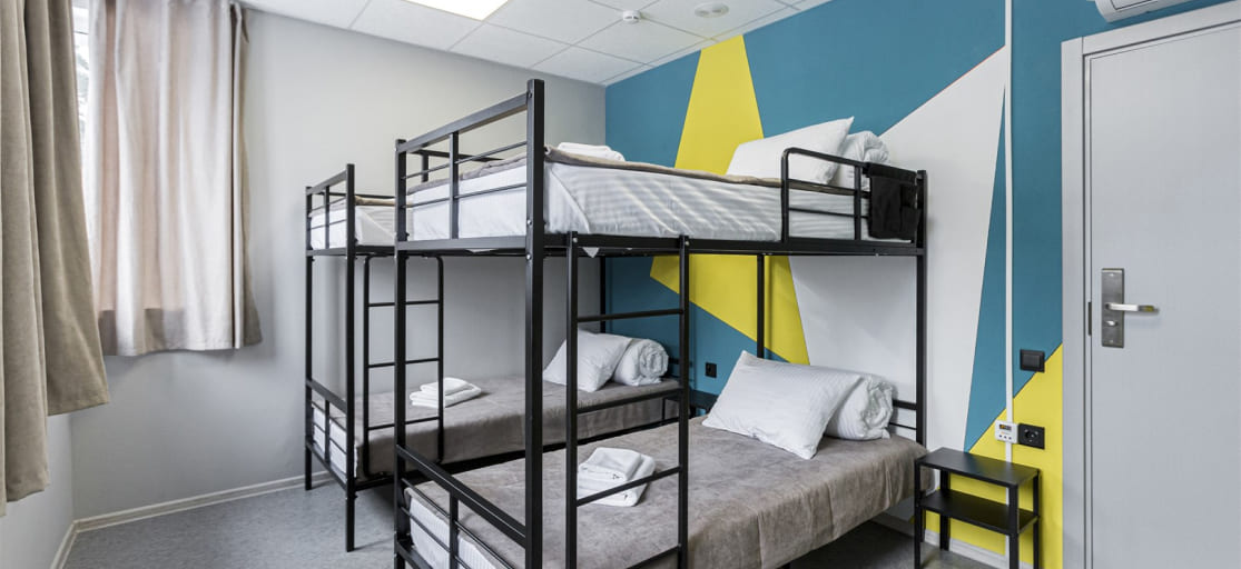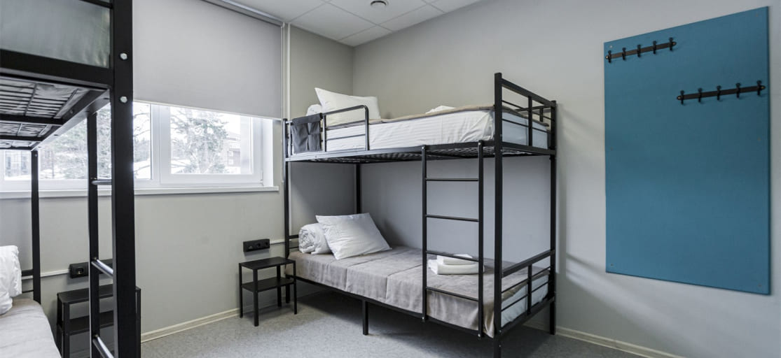 Однокомнатный номер: три двухъярусные односпальные кровати с ортопедическими матрасами, вешалка, полки для хранения мелочей. Теплые полы, кондиционер.