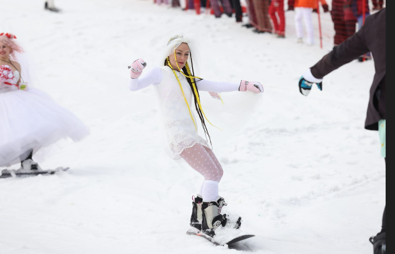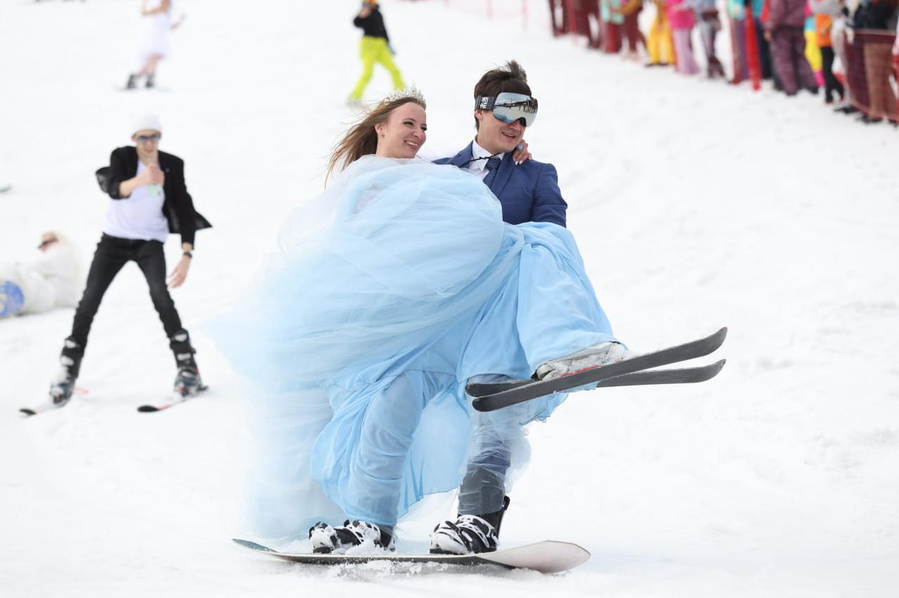 Пышные платья, свадебные костюмы вместе со снарягой туристы наденут на Свадебный спуск 14 апреля. Райдеры смогут прийти на старт как пары, так и в одиночку — в поисках своей половинки.