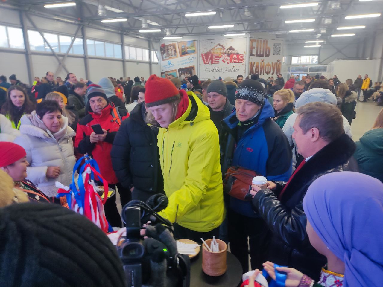 Здесь пассажиров встретил шерегешский «Йети» и шорцы. Туристы узнали о традициях местного коренного-малочисленного народа и даже поучаствовали в обряде «Благопожелания», загадали желания и повязали ленту на березу — священное для шорцев дерево.