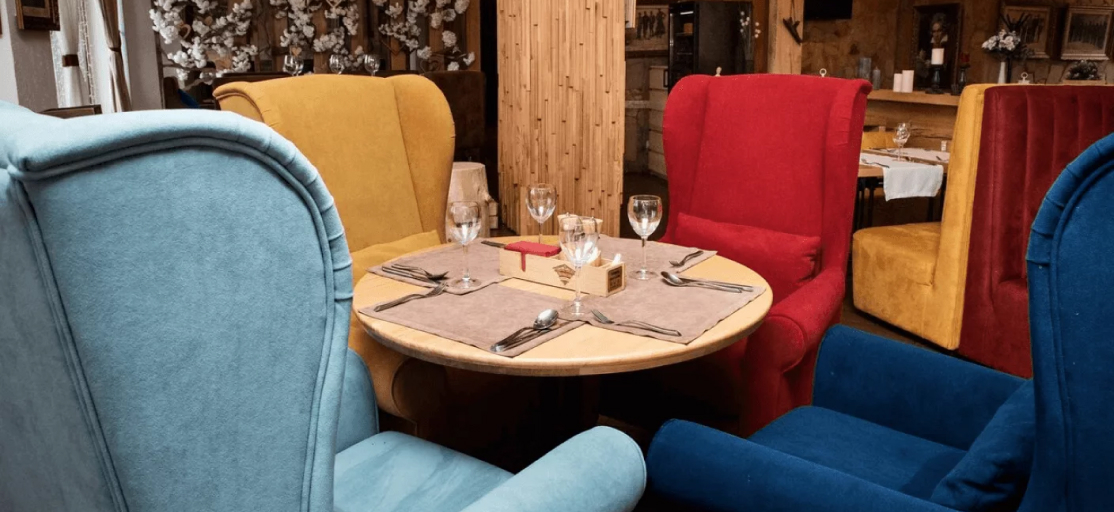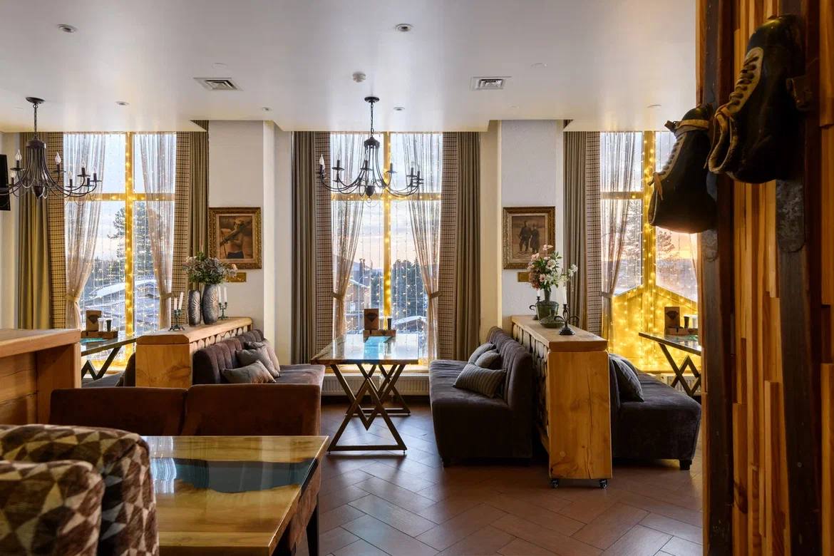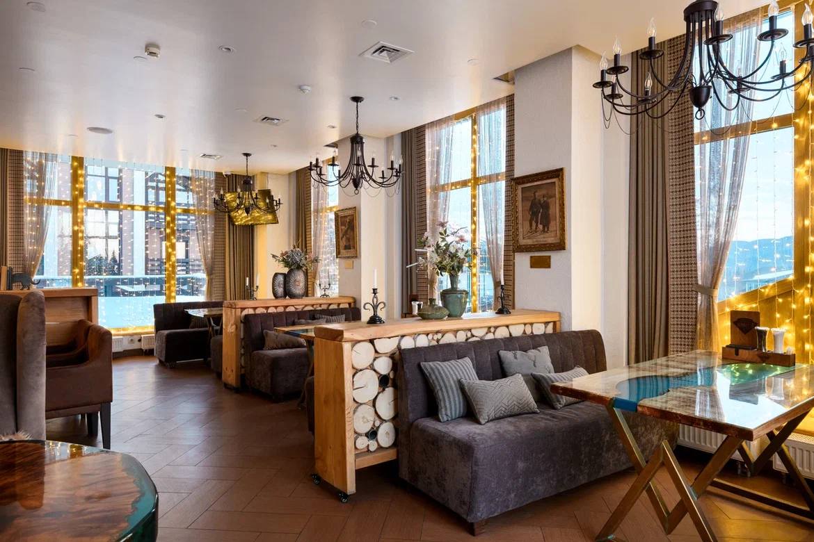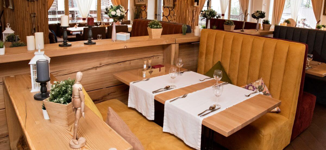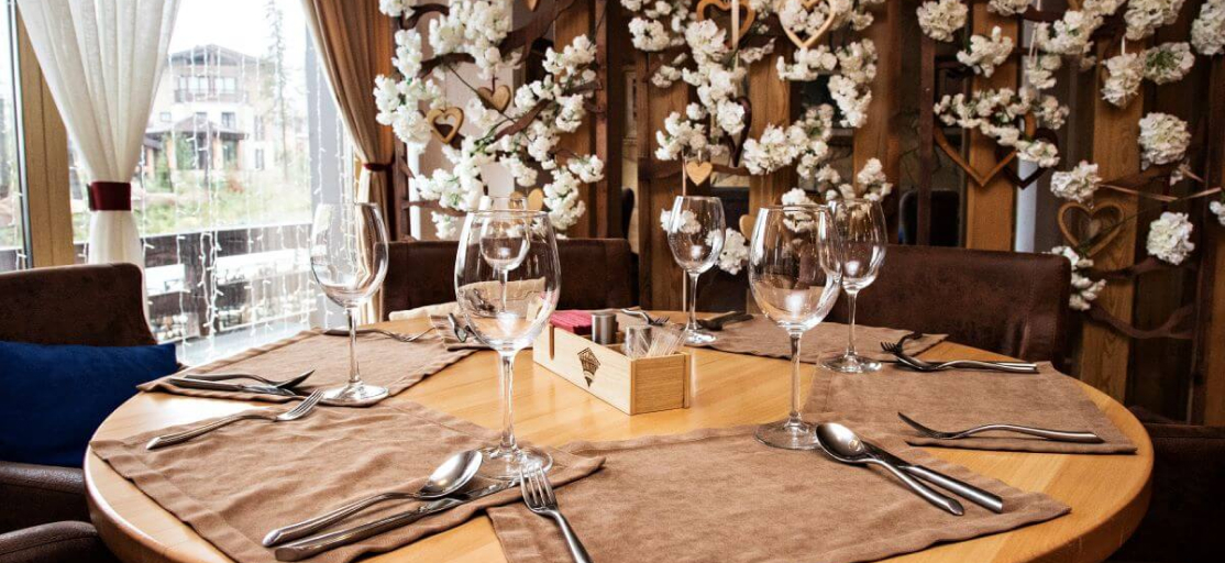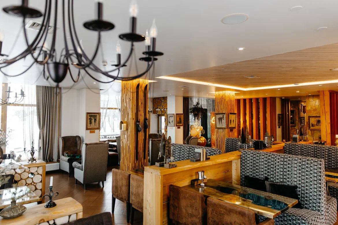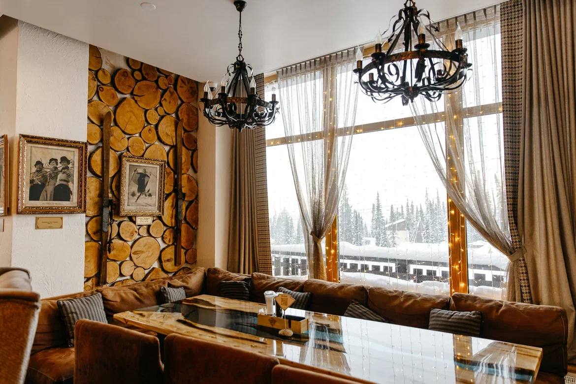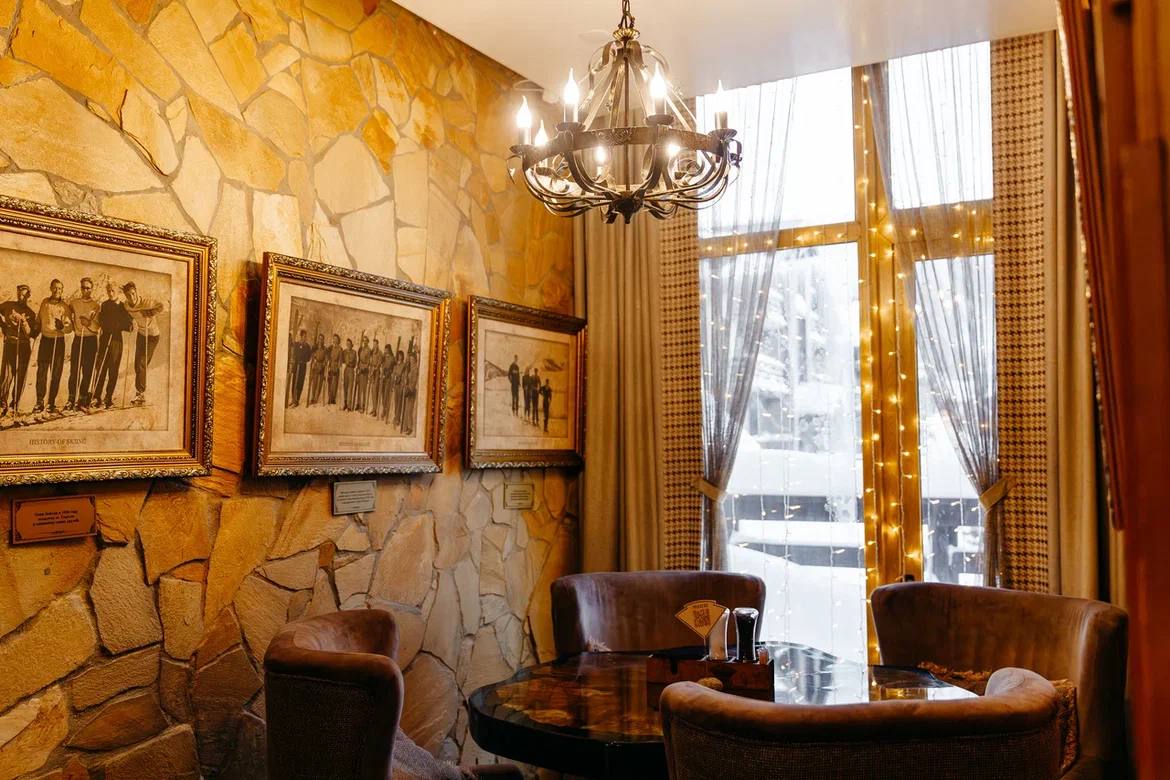 Интерьер ресторана выполнен в стиле рустик. Из витражных окон открывается живописная горная панорама - одно из достоинств ресторана Alpen Club.
