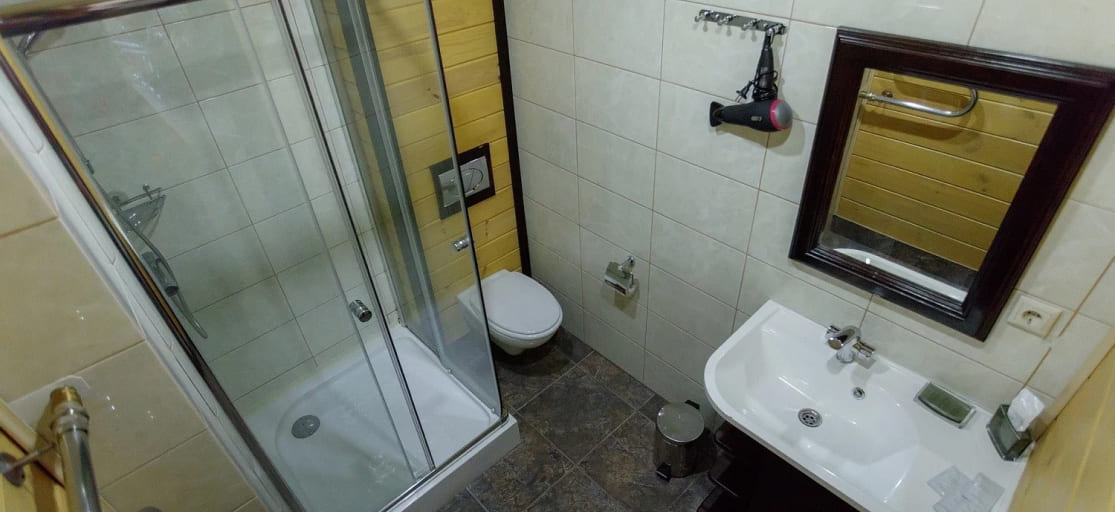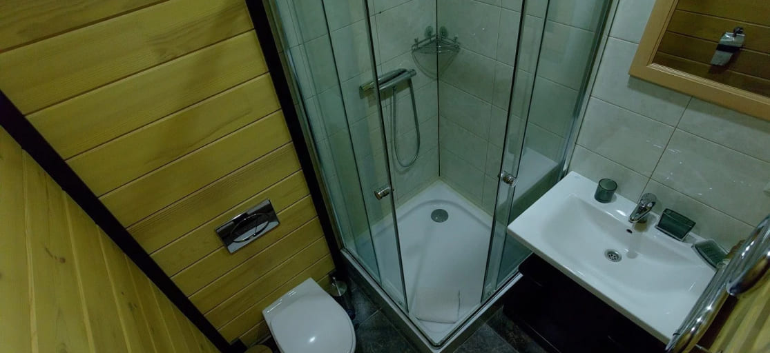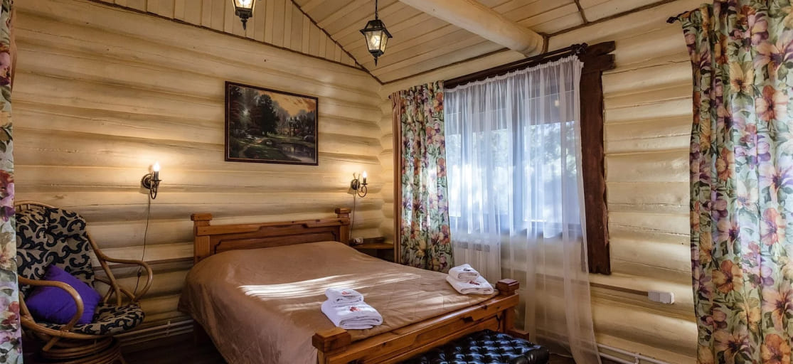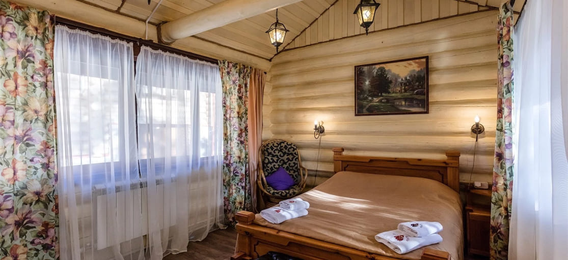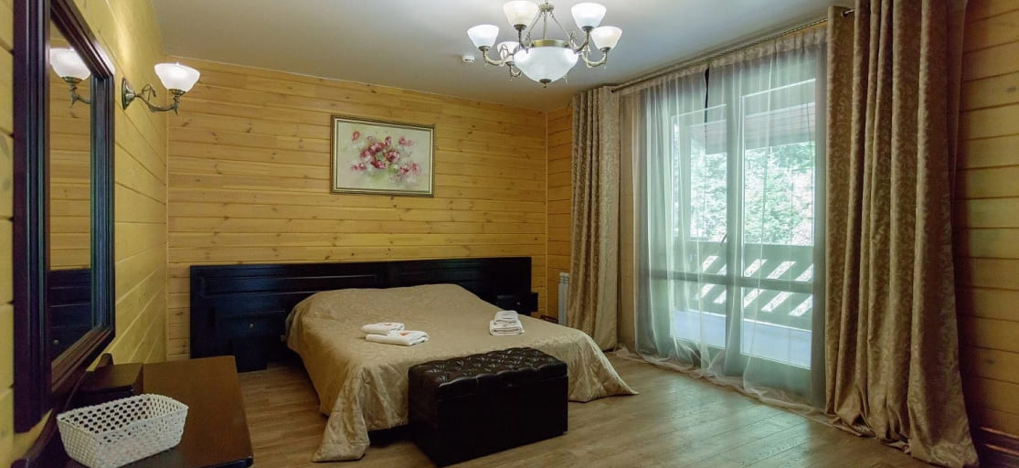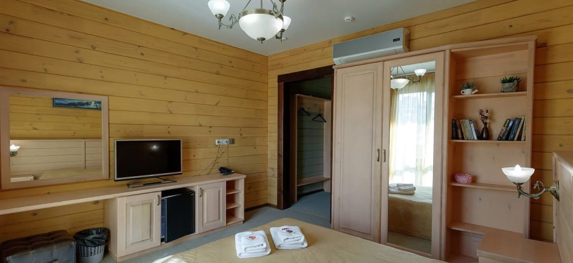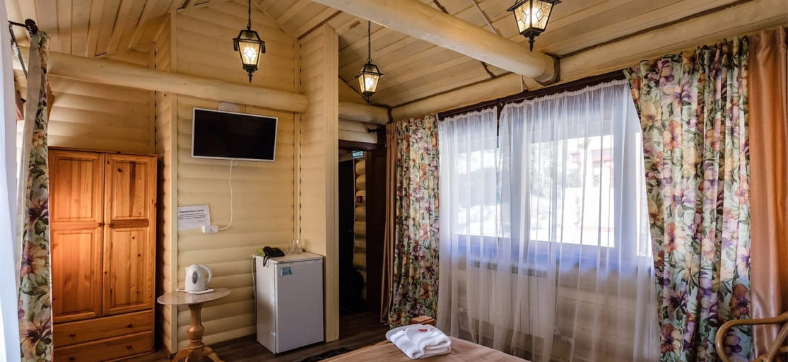 Одноэтажный отдельно стоящий домик. Расположен между гостиницей и шале Сказка. Двуспальная кровать, ТВ, холодильник, шкаф 2-х створчатый, кресло. с/у: душевая кабинка, раковина, зеркало, унитаз, фен