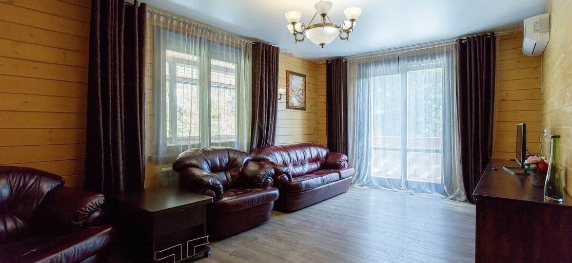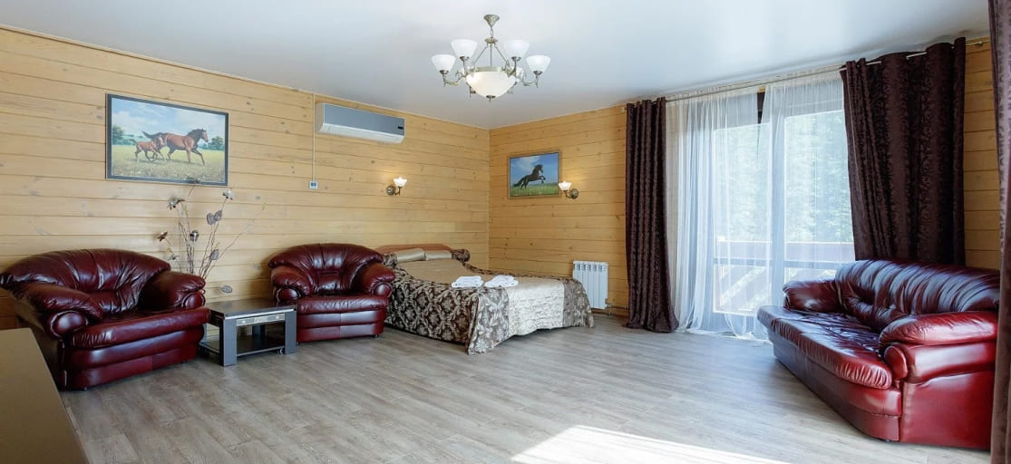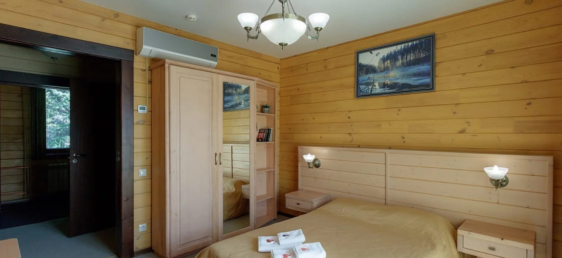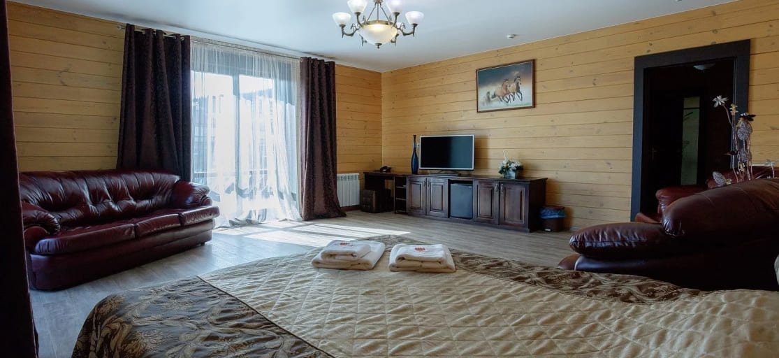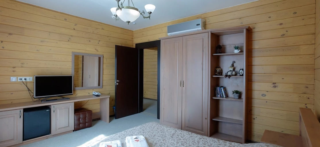 Двухкомнатный номер. В номере: двуспальная кровать 160х200 см, раздвижной диван, кресло, шкаф, TV, холодильник, чайник, санузел, душевая кабина, фен