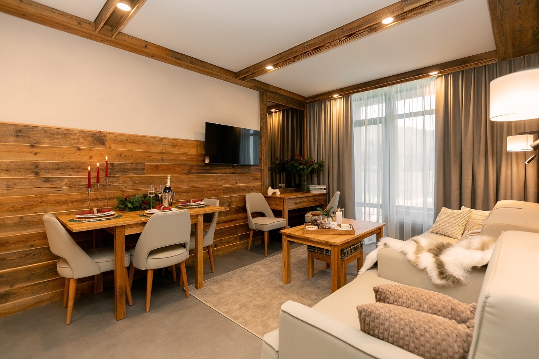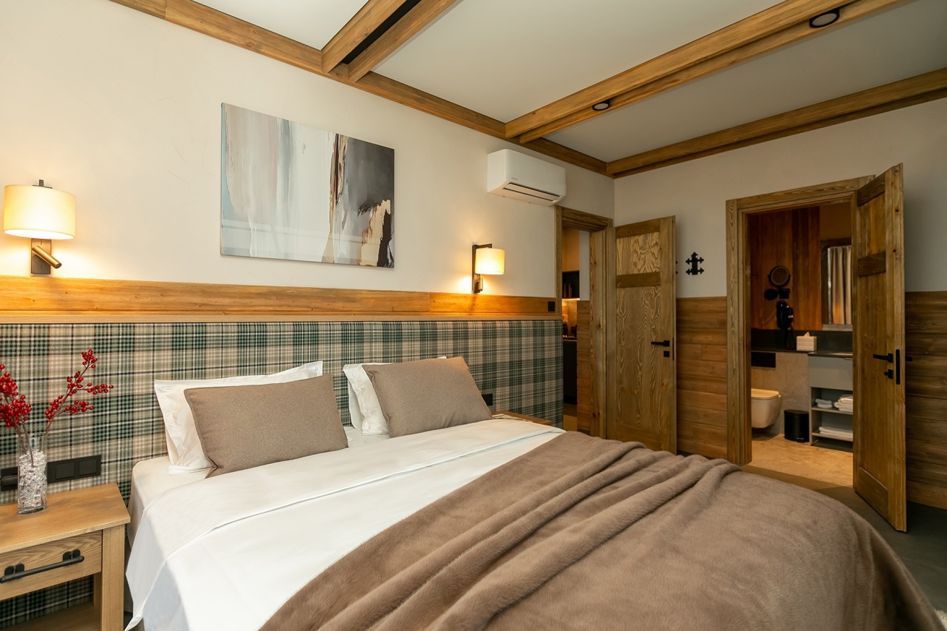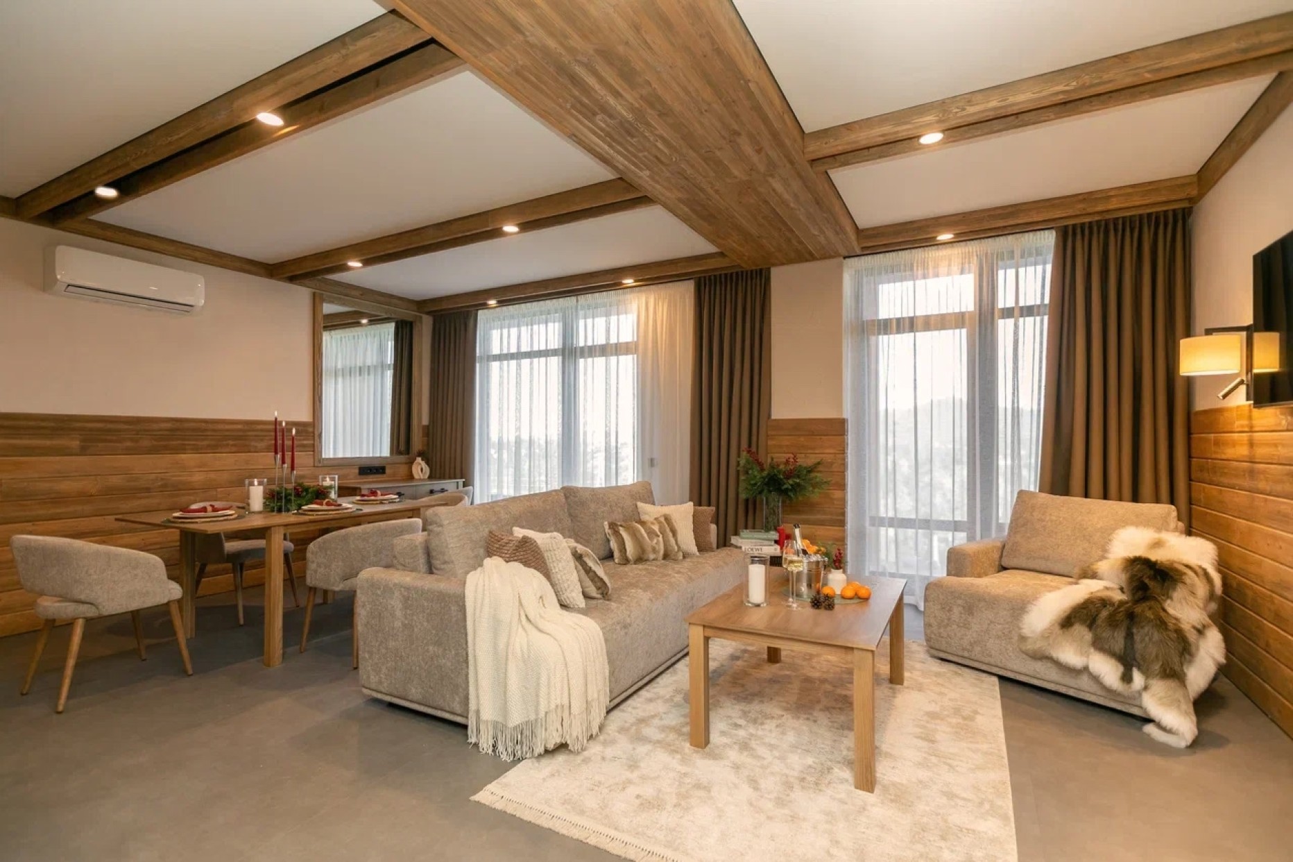 Идеальный вариант для комфортного отдыха большой семьи или компании друзей в окружении снежных гор. Благородные древесные тона, мягкие ткани и спокойная палитра создают атмосферу уюта. Просторный номер площадью 95 м², объединённый из двух категорий — «Стандарт» и «Люкс» и оснащённый дополнительной межкомнатной дверью, включает две спальни, две ванные комнаты, кухню с варочной панелью и просторную гостиную с обеденной зоной.