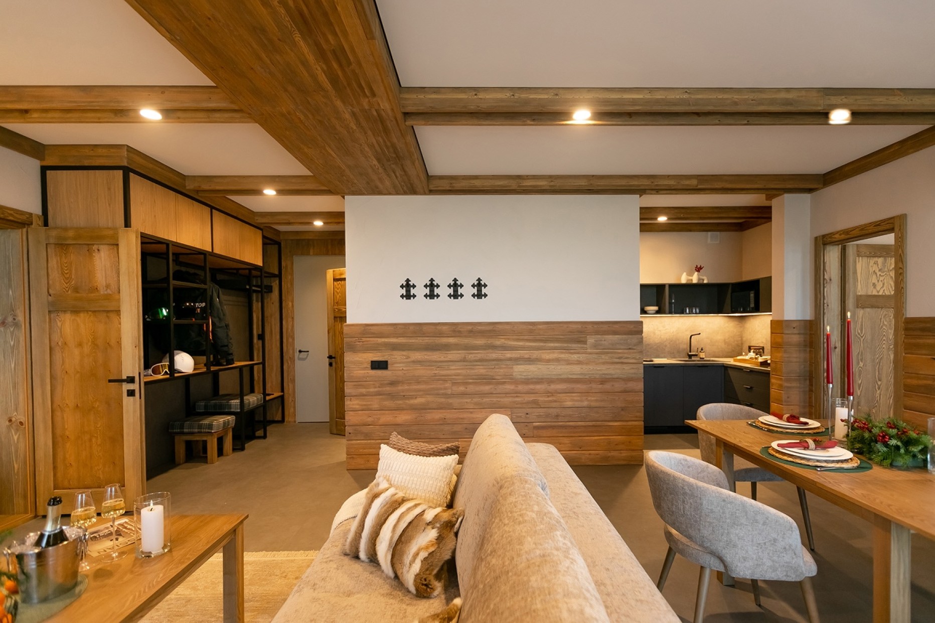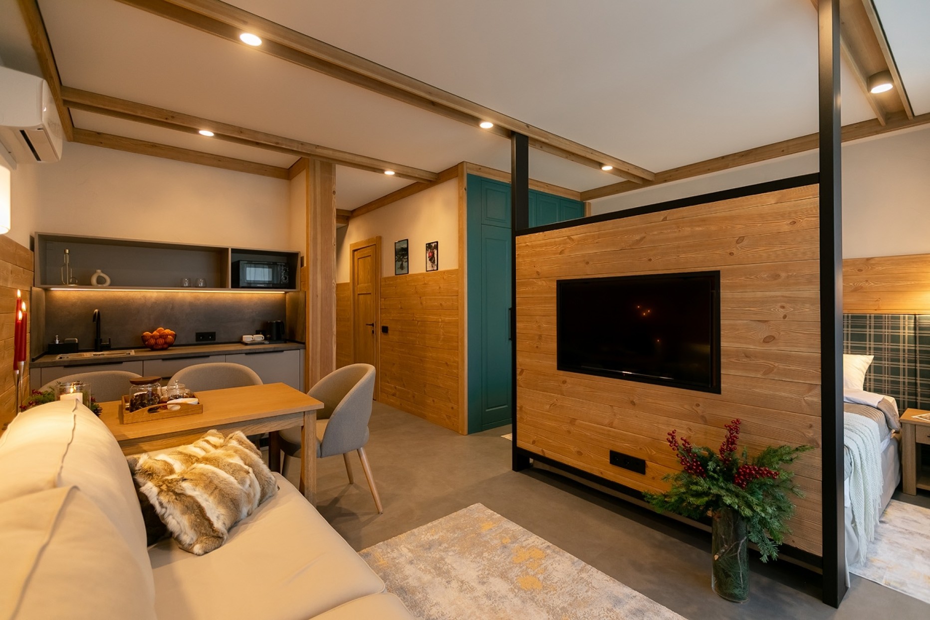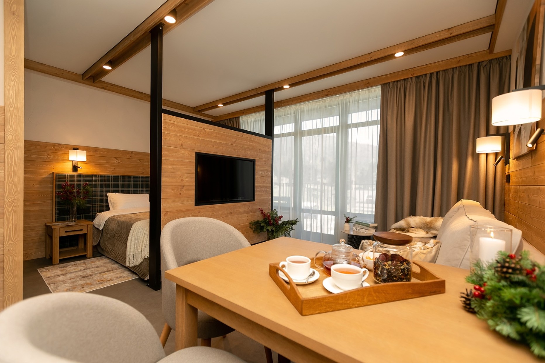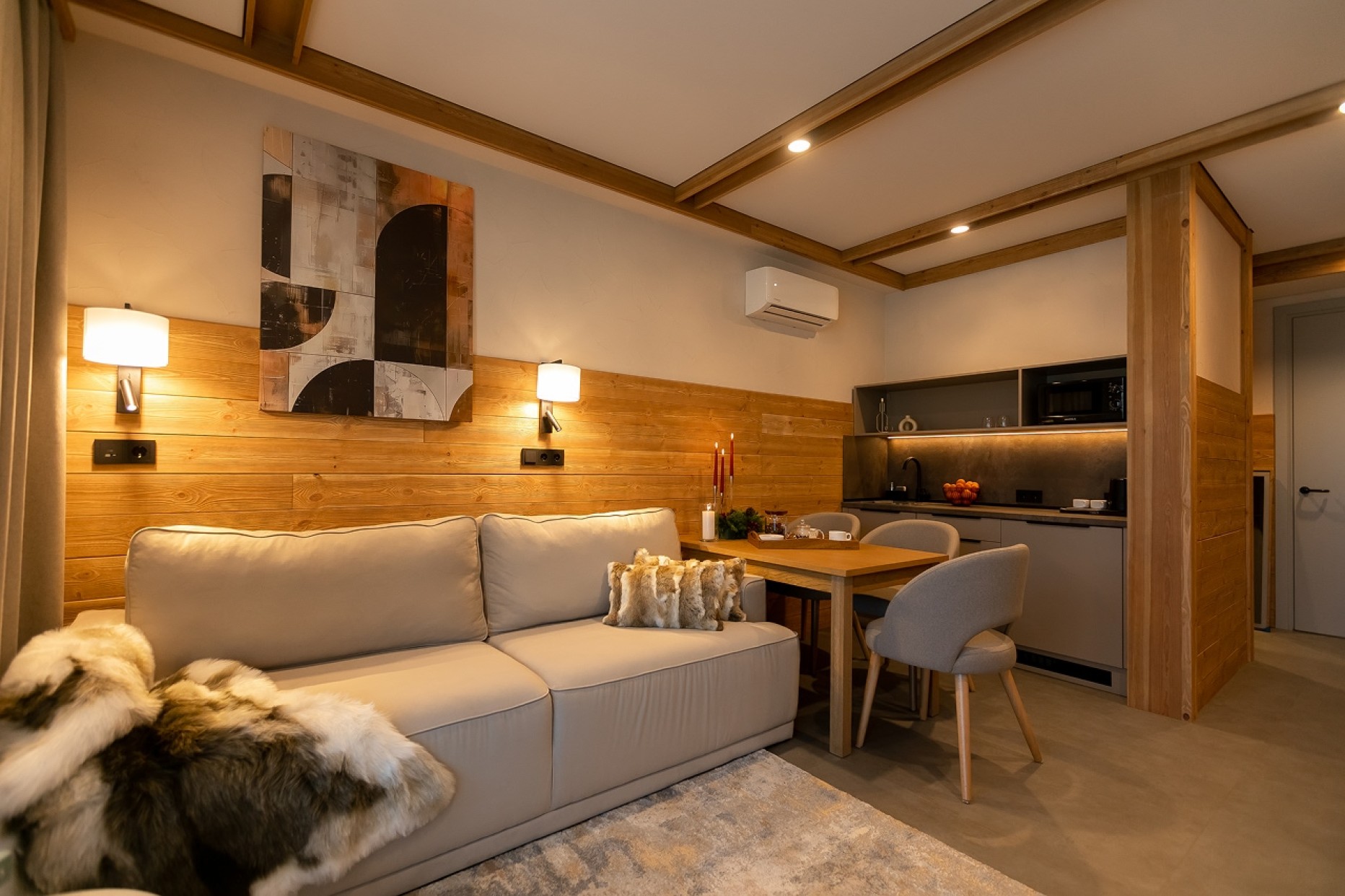 Идеальный вариант для комфортного отдыха большой семьи или компании друзей в окружении снежных гор. Благородные древесные тона, мягкие ткани и спокойная палитра создают атмосферу уюта. Просторный номер площадью 95 м², объединённый из двух категорий — «Стандарт» и «Люкс» и оснащённый дополнительной межкомнатной дверью, включает две спальни, две ванные комнаты, кухню с варочной панелью и просторную гостиную с обеденной зоной.
