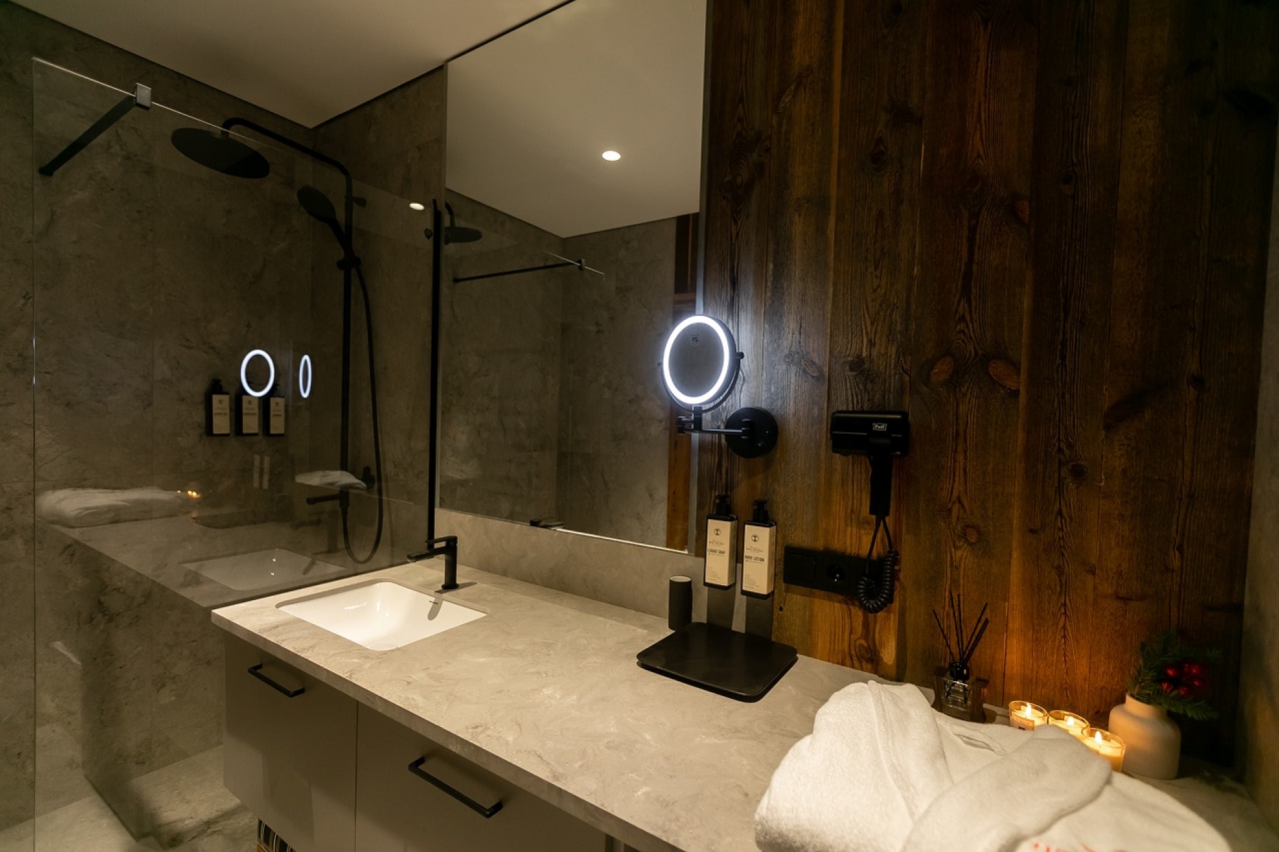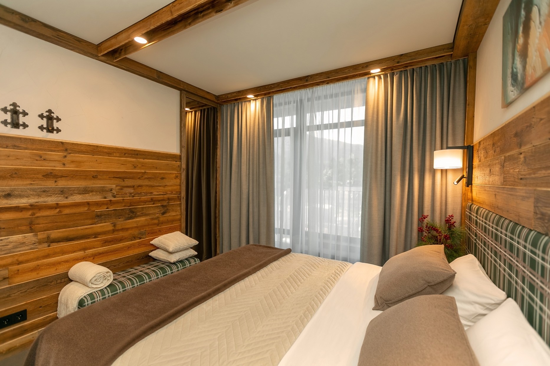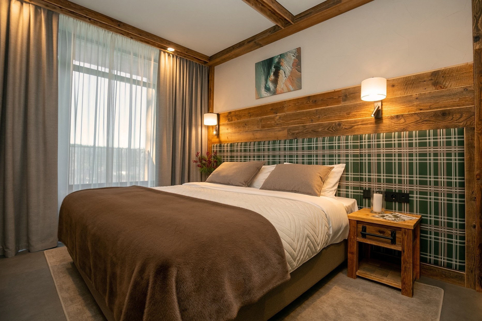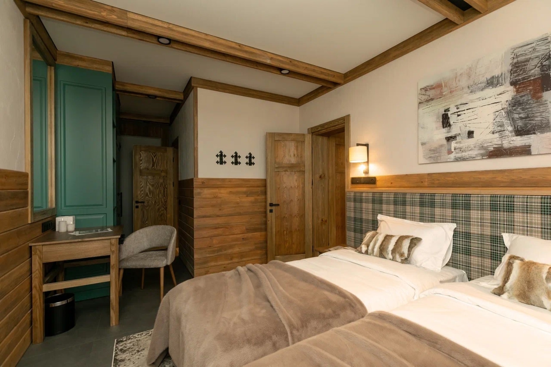 Альпийский стиль в сочетании с теплыми, древесными акцентами создает ощущение расслабления и уюта, где каждая деталь дарит покой после активного дня на склонах.
