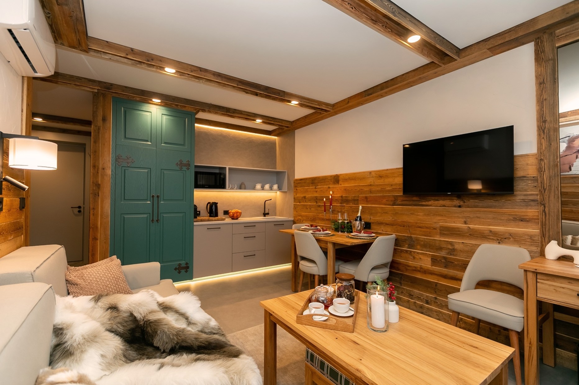 Открытая кухня позволяет наблюдать за процессом приготовления, а интерьер в натуральных оттенках и панорамные виды на горы создают особую атмосферу уюта и горного настроения.
