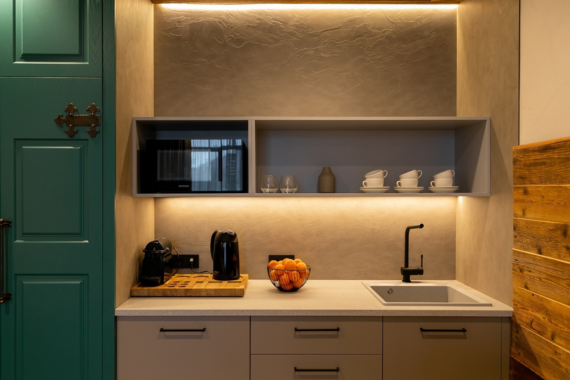 Кухня-гостиная без варочной панели: микроволновая печь, холодильник, бутилированная вода, чайник, кофемашина, стиральная машина, мини-бар, набор столовой посуды.