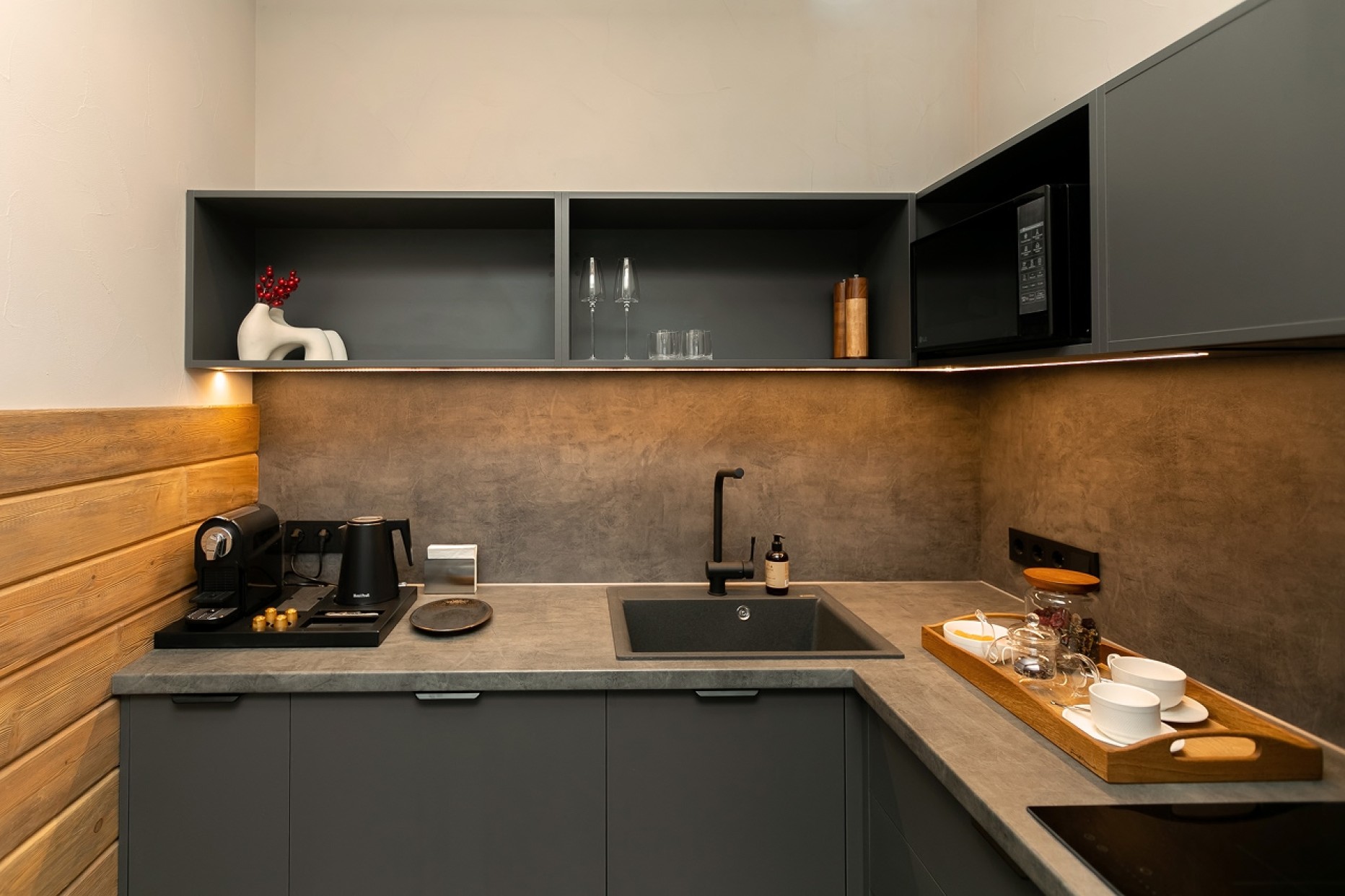 микроволновая печь, холодильник, бутилированная вода, чайник, кофемашина, мини-бар, набор столовой посуды.