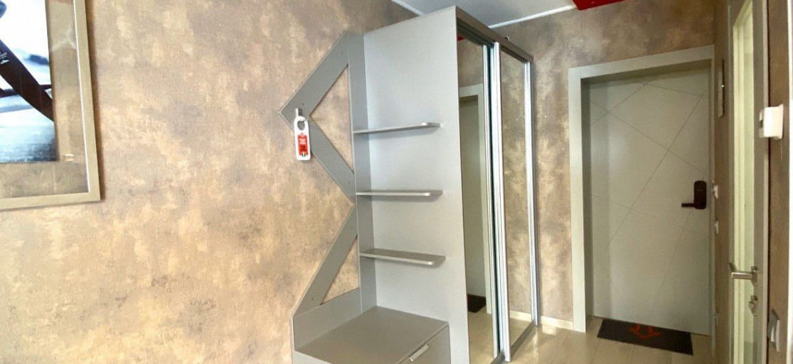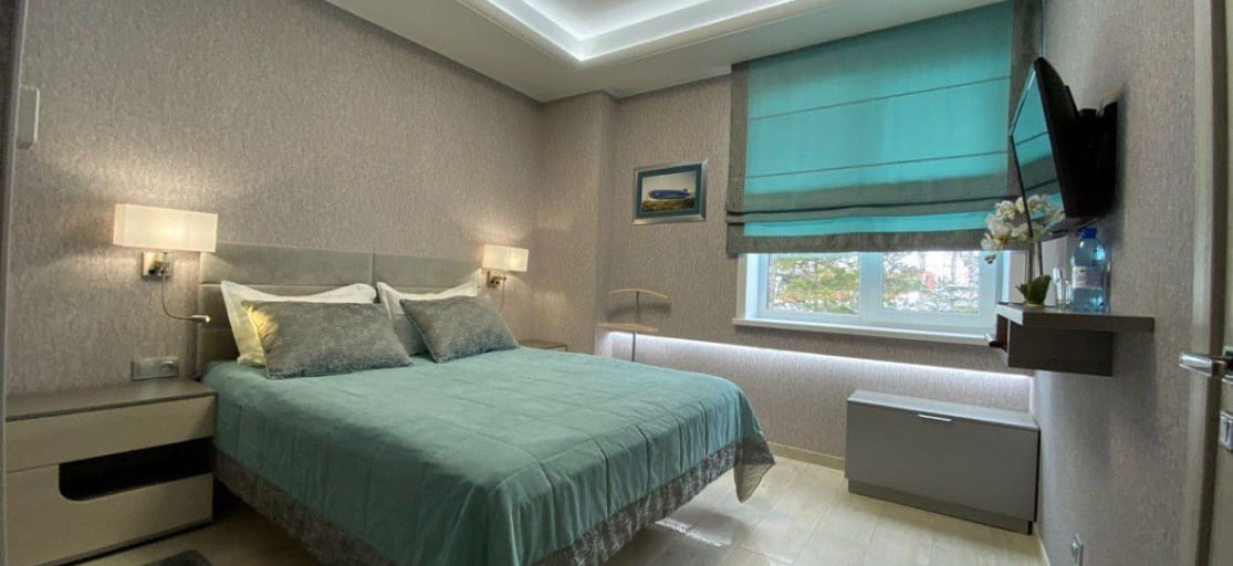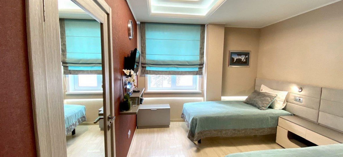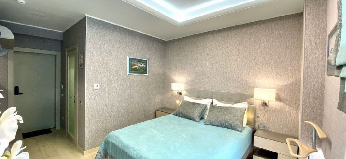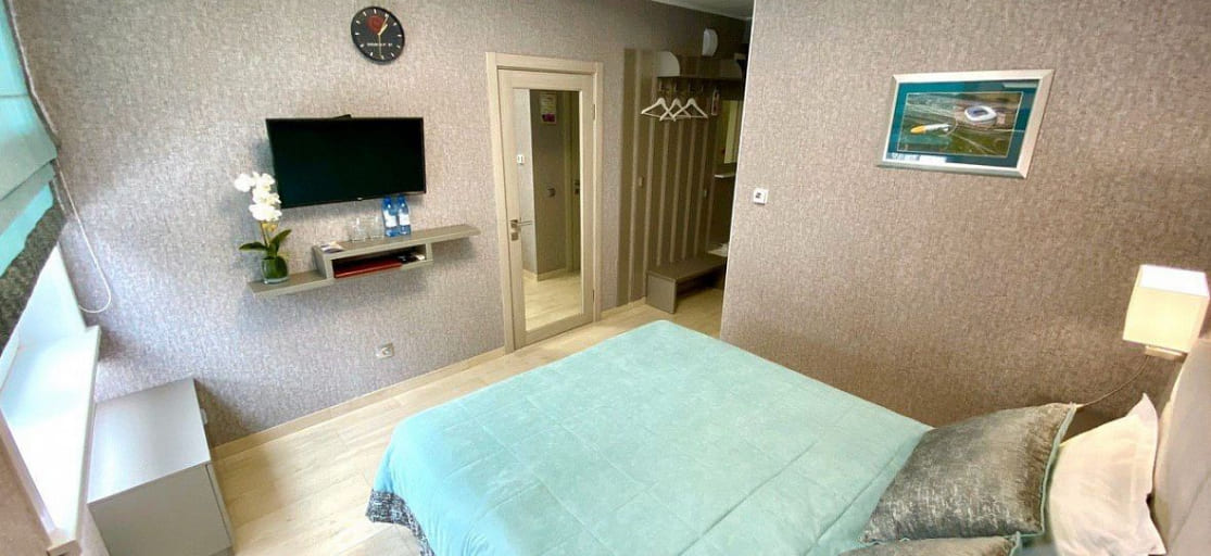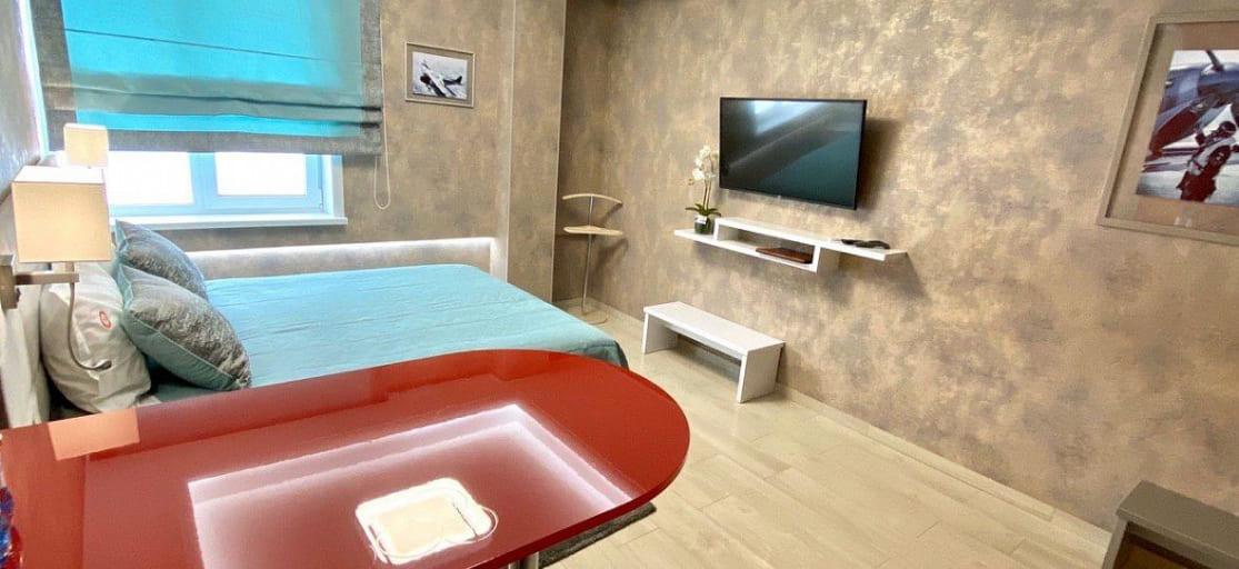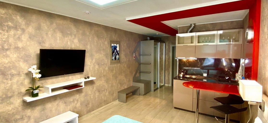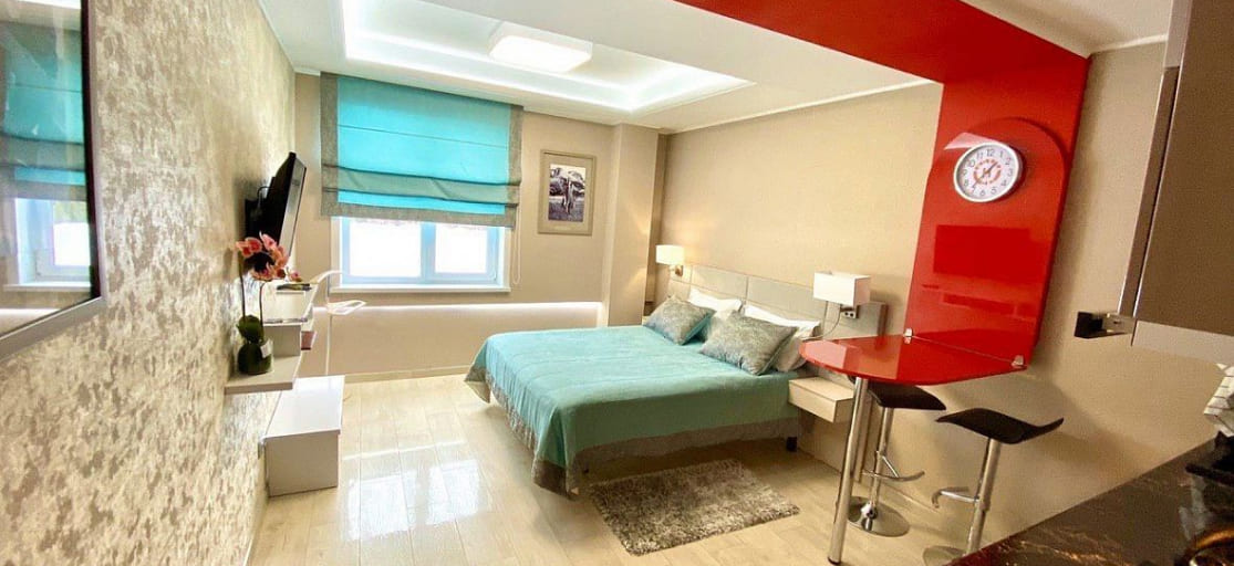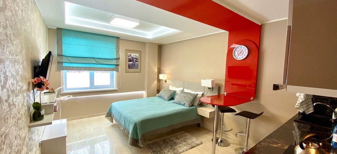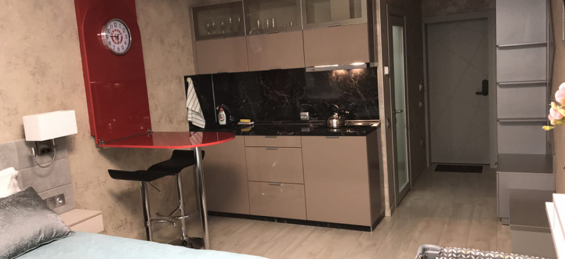 Студия площадью 28 м² отлично подойдет для семейного отдыха. В номере созданы все условия для комфортного проживания: Двуспальная кровать. Раскладная кровать. Телевизор. Санузел с душевой кабиной. Шкаф для одежды. 3 прикроватных тумбочки для хранения принадлежностей. Обеденный и журнальные столы. Зеркало, фен. Чайный набор: посуда, чайник, чай. Полноценная кухня с посудой Сейф. Халат, тапочки. В номере проводится регулярная смена белья и ежедневная уборка.